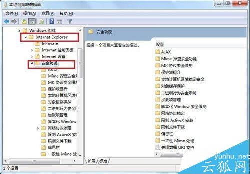 3、点击“Internet Explorer”,选择“安全功能”,如下图所示: