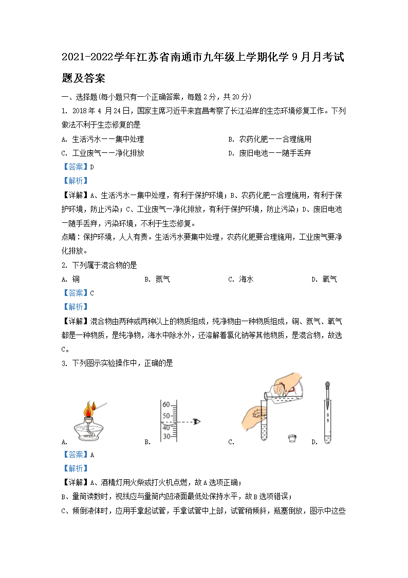 2021-2022学年江苏省南通市九年级上学期化学9月月考试题及答案(Word版)09-16