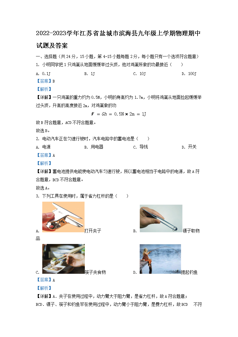 2022-2023学年江苏省盐城市滨海县九年级上学期物理期中试题及答案(Word版)10-14