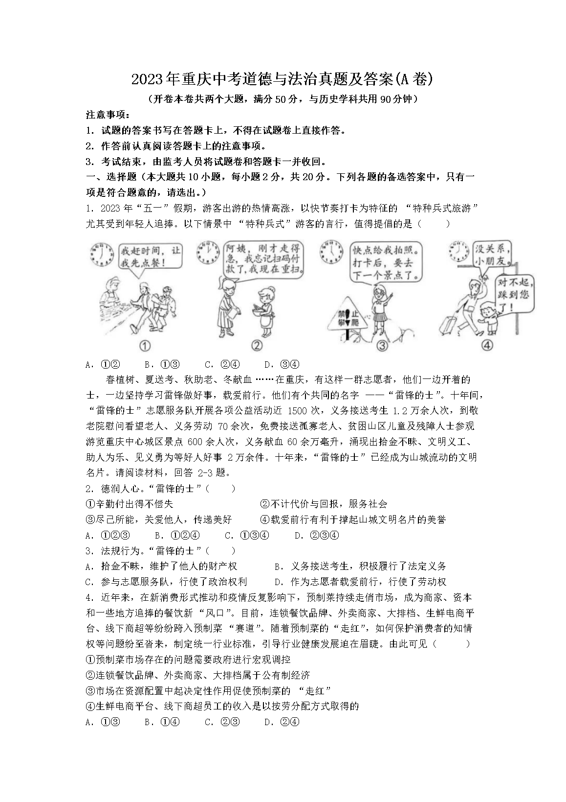 2023年重庆中考道德与法治真题及答案(A卷)(Word版)06-17