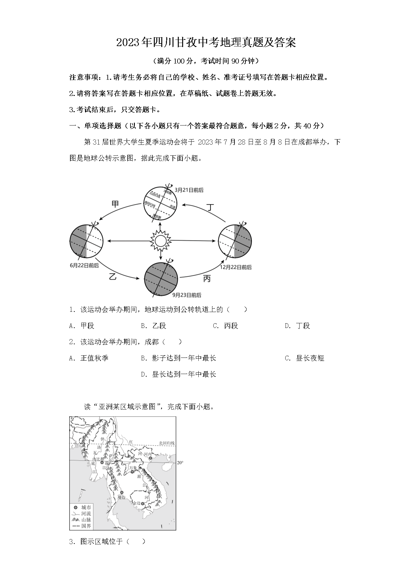 【文档预览】 文档大全网整理发布2023年四川甘孜中考地理真题及答案(Word版),前五页预览如下: