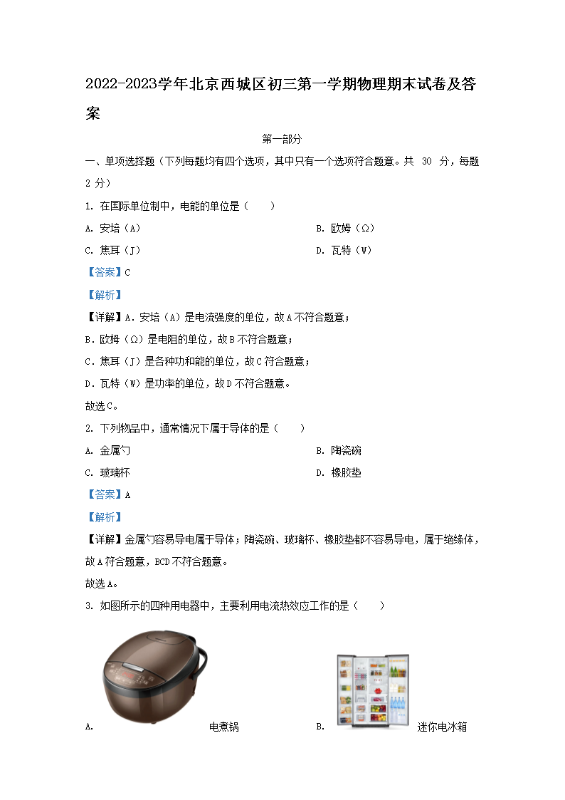 2022-2023学年北京西城区初三第一学期物理期末试卷及答案(Word版)08-08