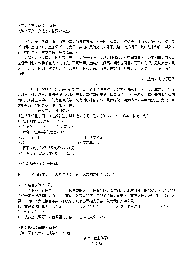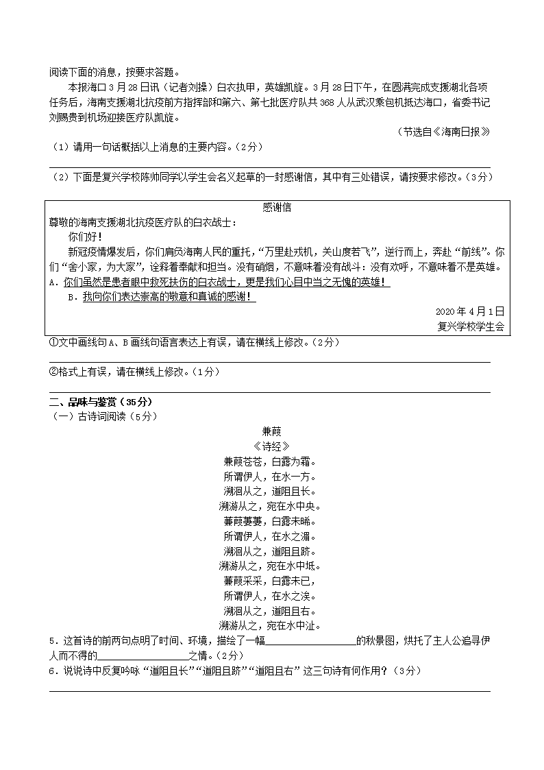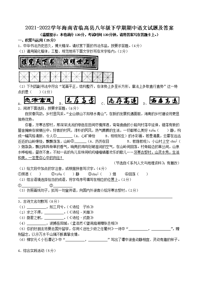 2021-2022学年海南省临高县八年级下学期期中语文试题及答案(Word版)10-17