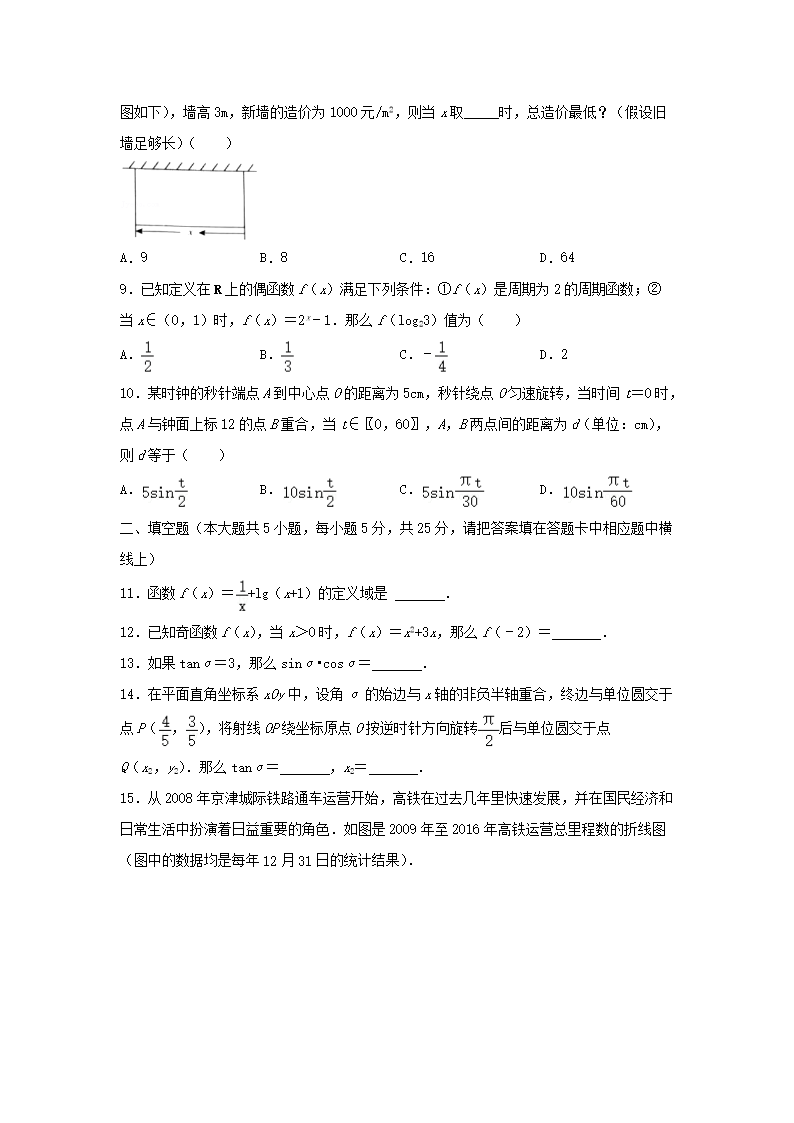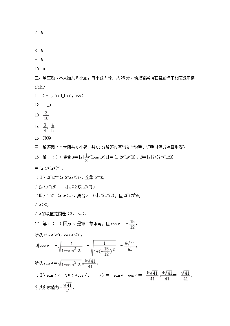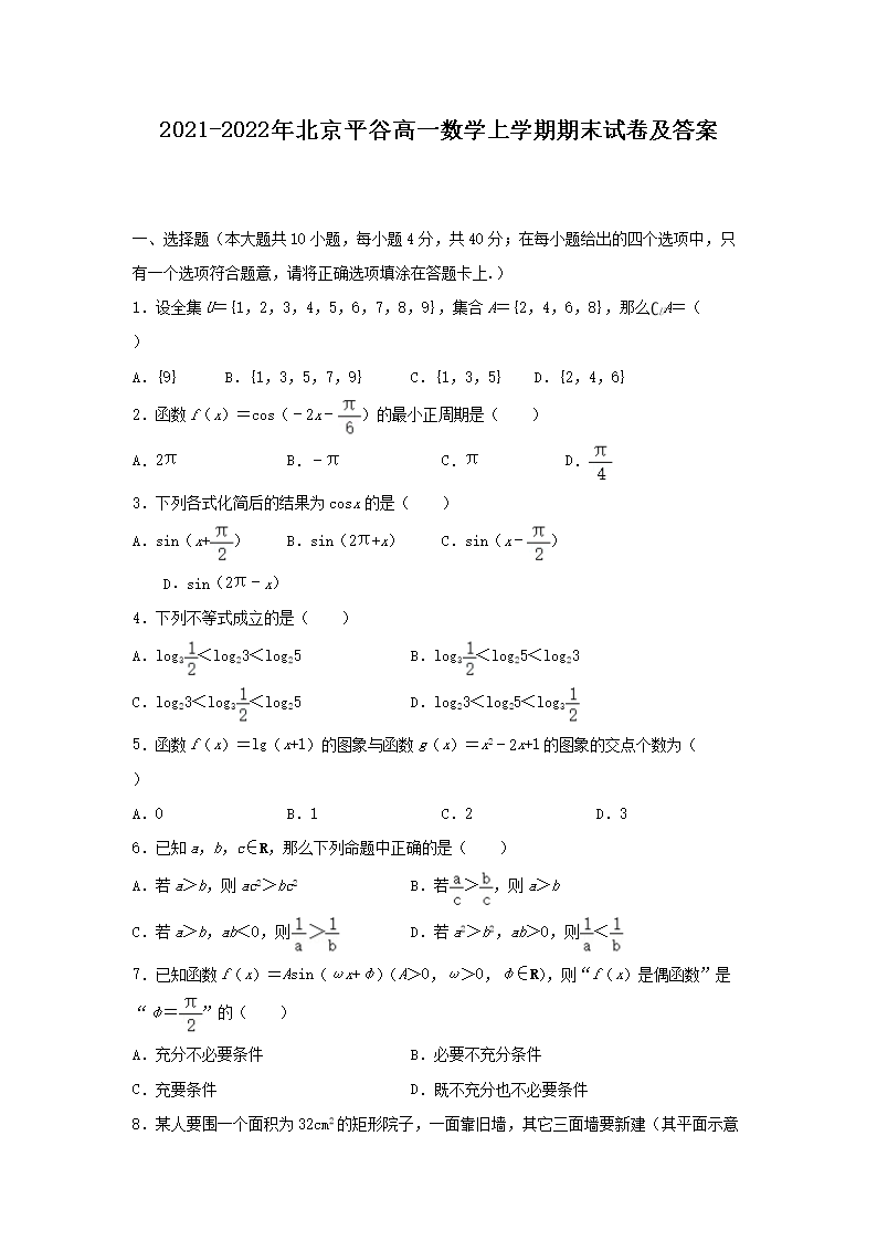 2021-2022年北京平谷高一数学上学期期末试卷及答案(Word版)08-30