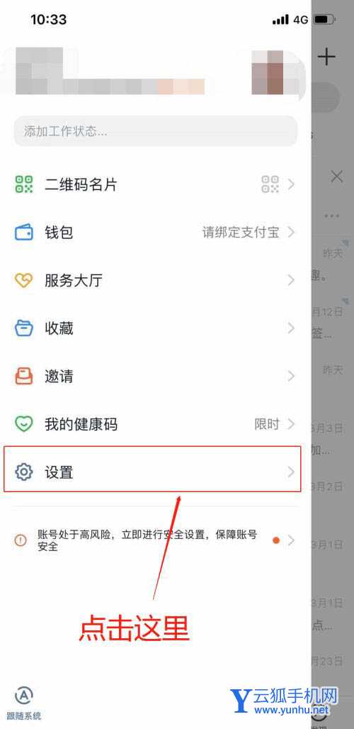 进入钉钉主页面后点击左上方个人头像,在弹出的这个界面点击设置。