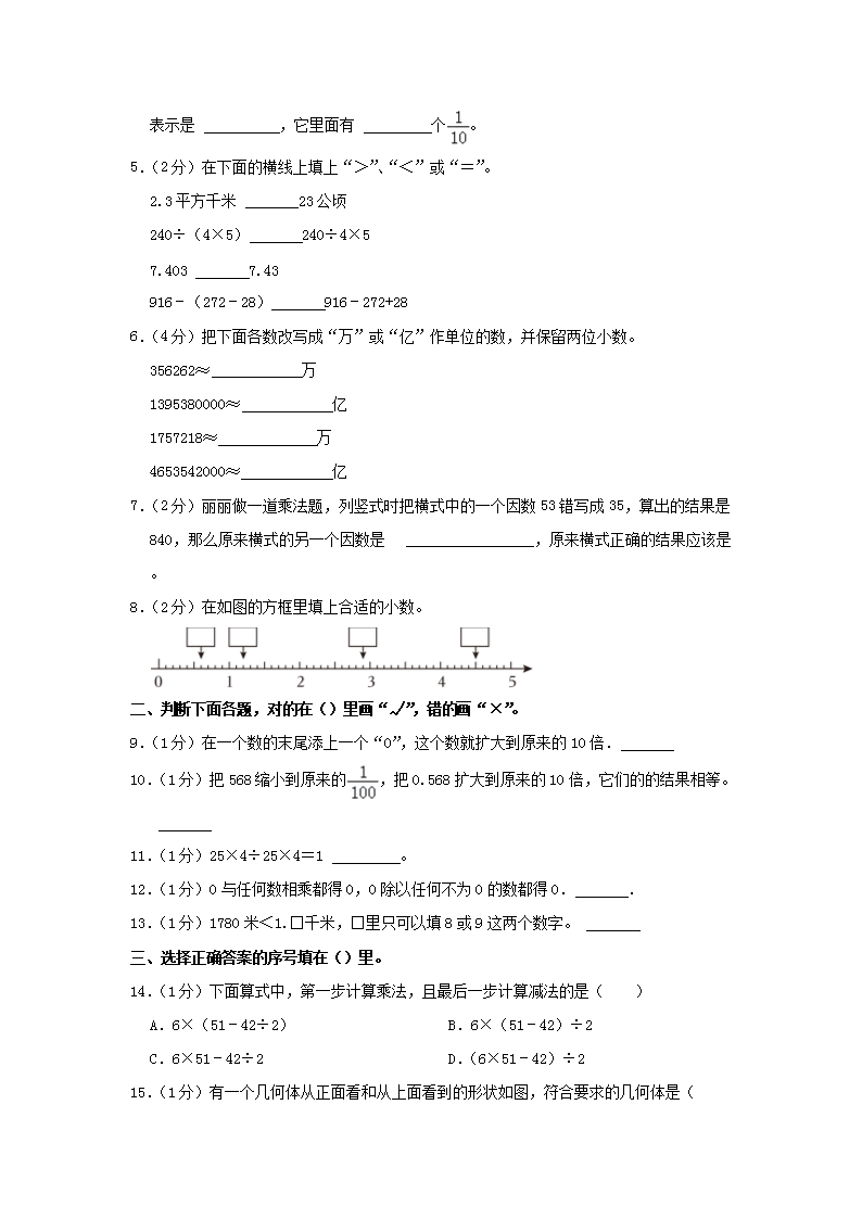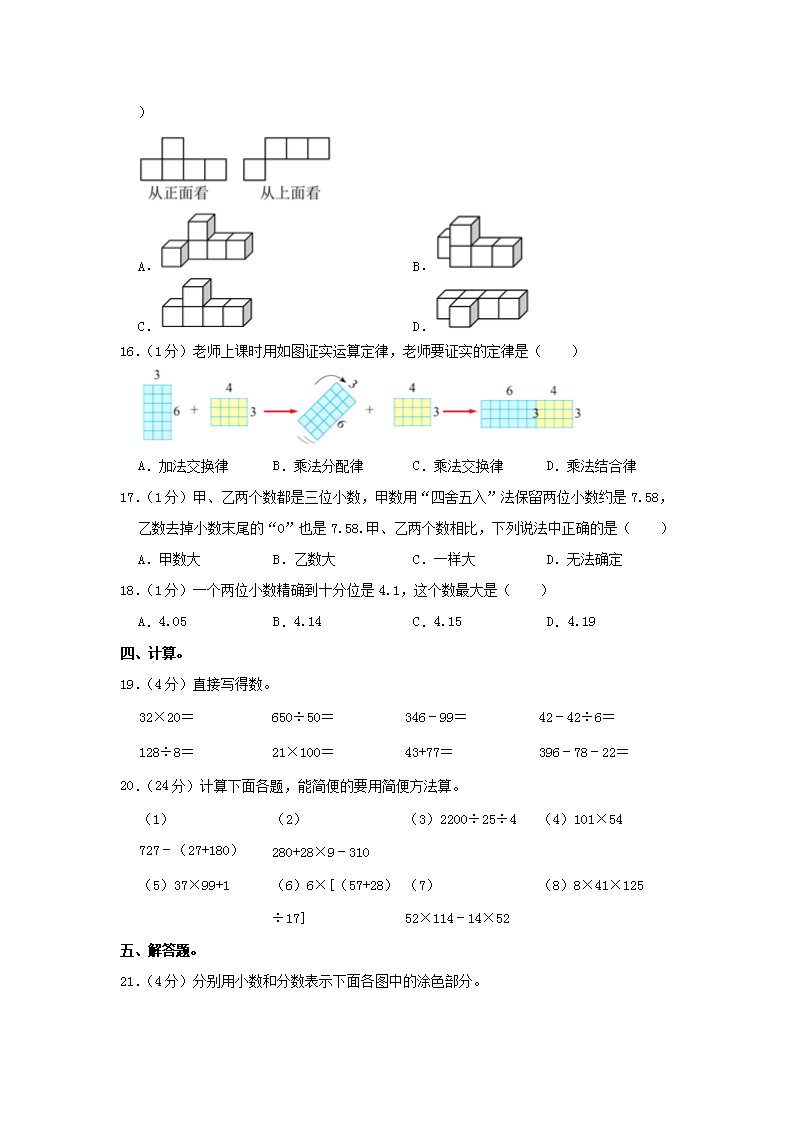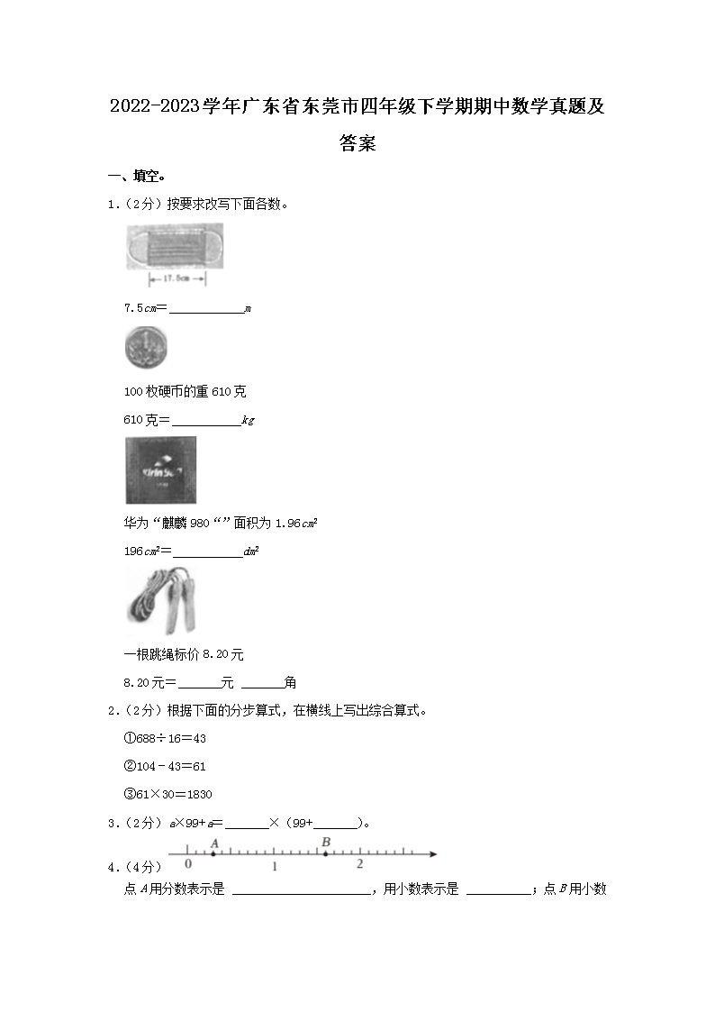 2022-2023学年广东省东莞市四年级下学期期中数学真题及答案(Word版)10-20