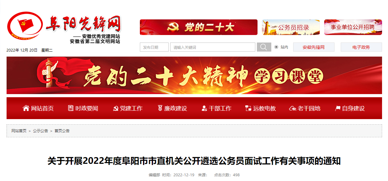 【#遴选# 导语】®文档大全网从阜阳先锋网了解到,2022年安徽阜阳市直机关遴选公务员面试时间:12月24日,相关事宜如下: