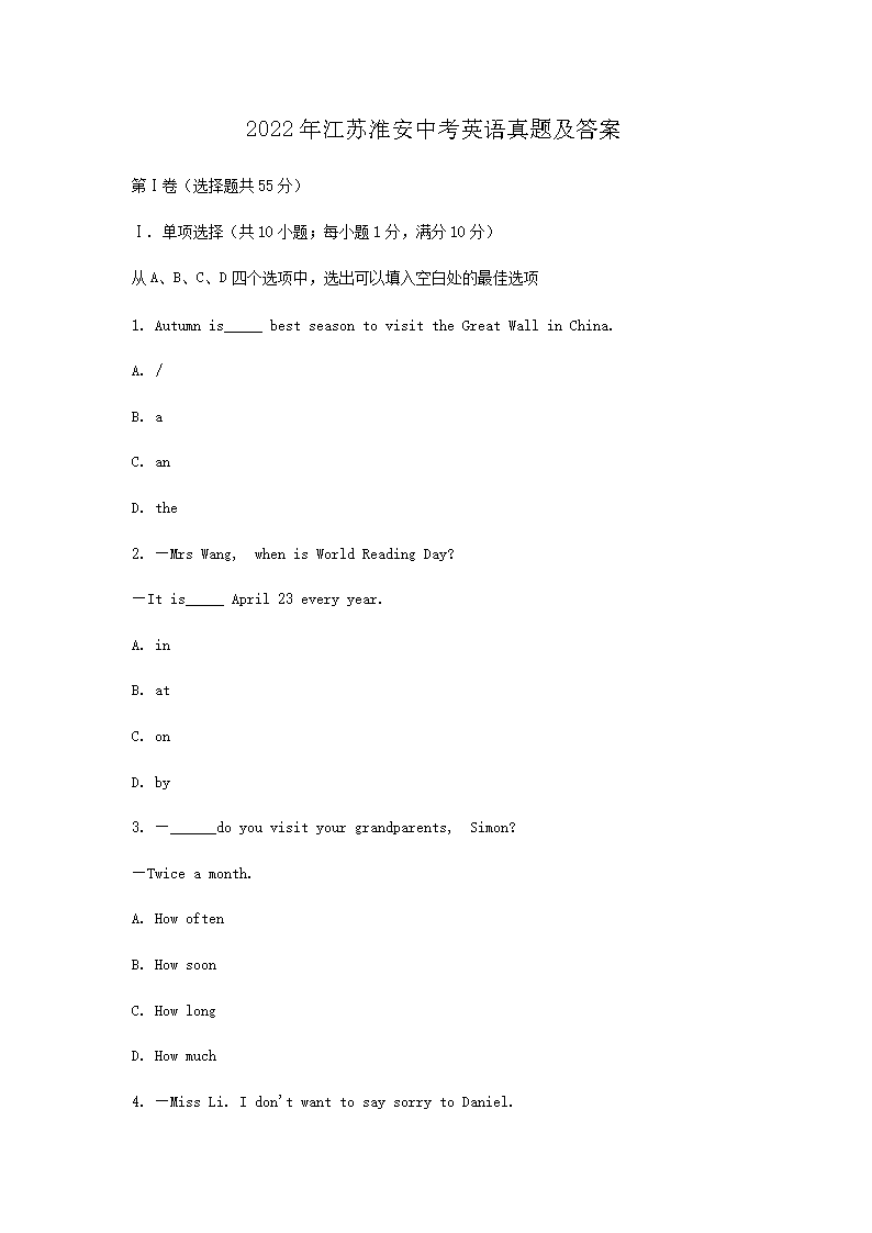 【文档预览】 文档大全网整理发布2022年江苏淮安中考英语真题及答案(Word版),前五页预览如下: