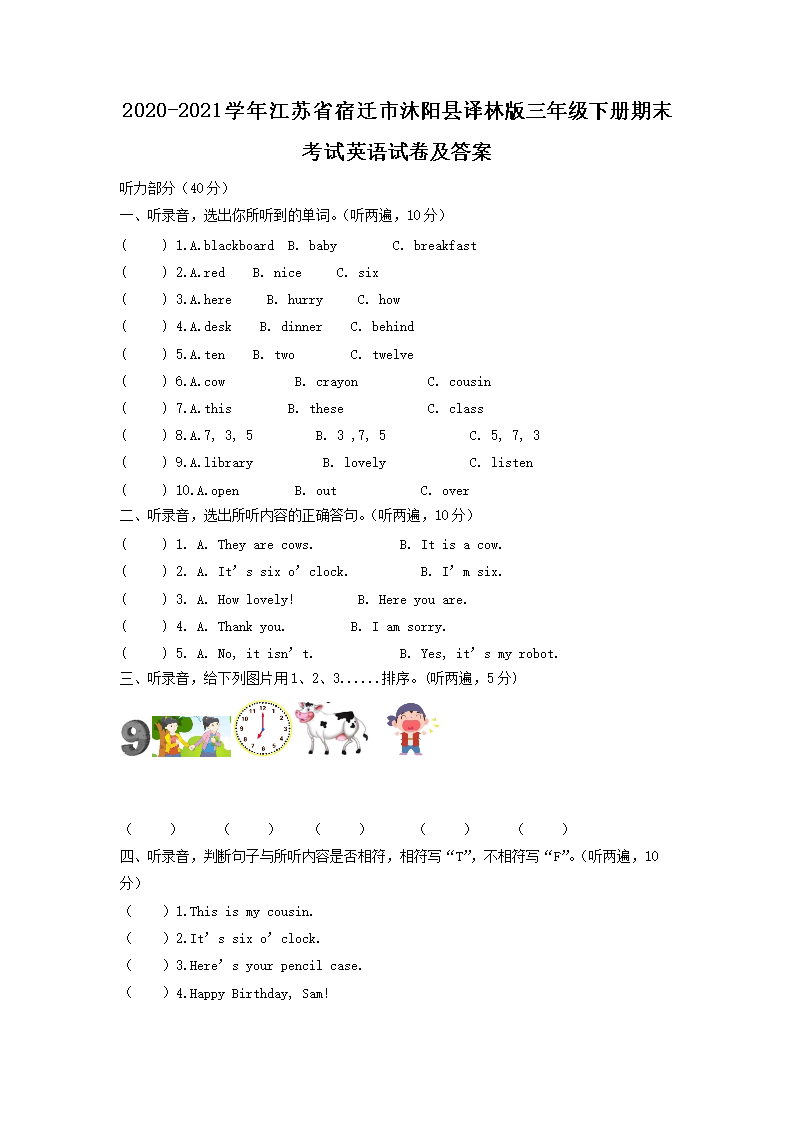 【文档预览】 文档大全网整理发布2020-2021学年江苏省宿迁市沐阳县译林版三年级下册期末考试英语试卷及答案(Word版),前五页预览如下: