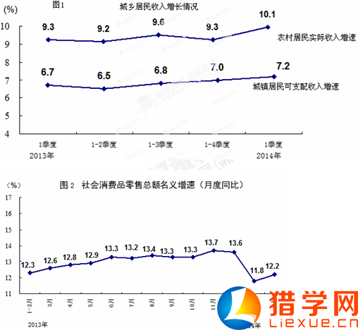 2013年第一季度到2014年第一季度我国城乡居民收入和社会消费品增长情况
