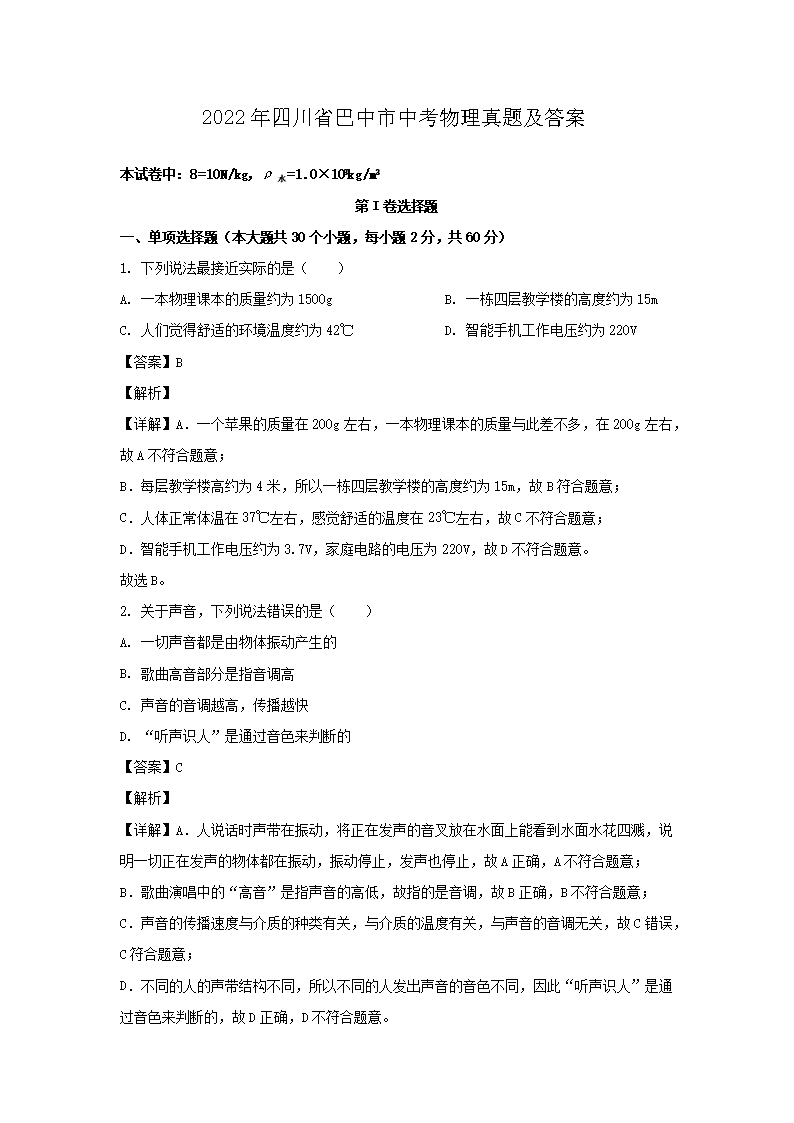 2022年四川省巴中市中考物理真题及答案(Word版)05-26