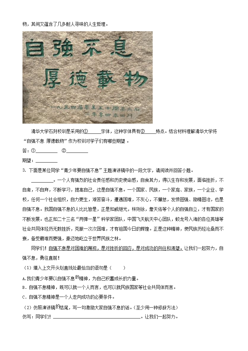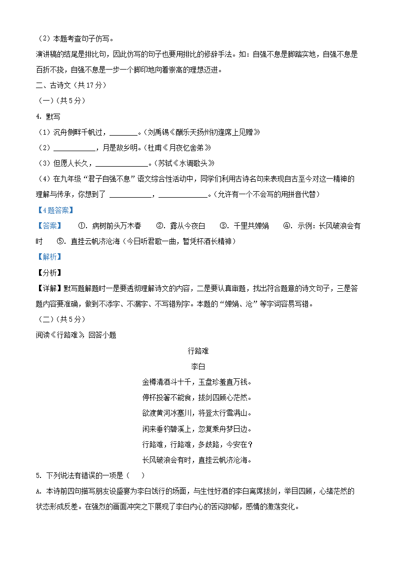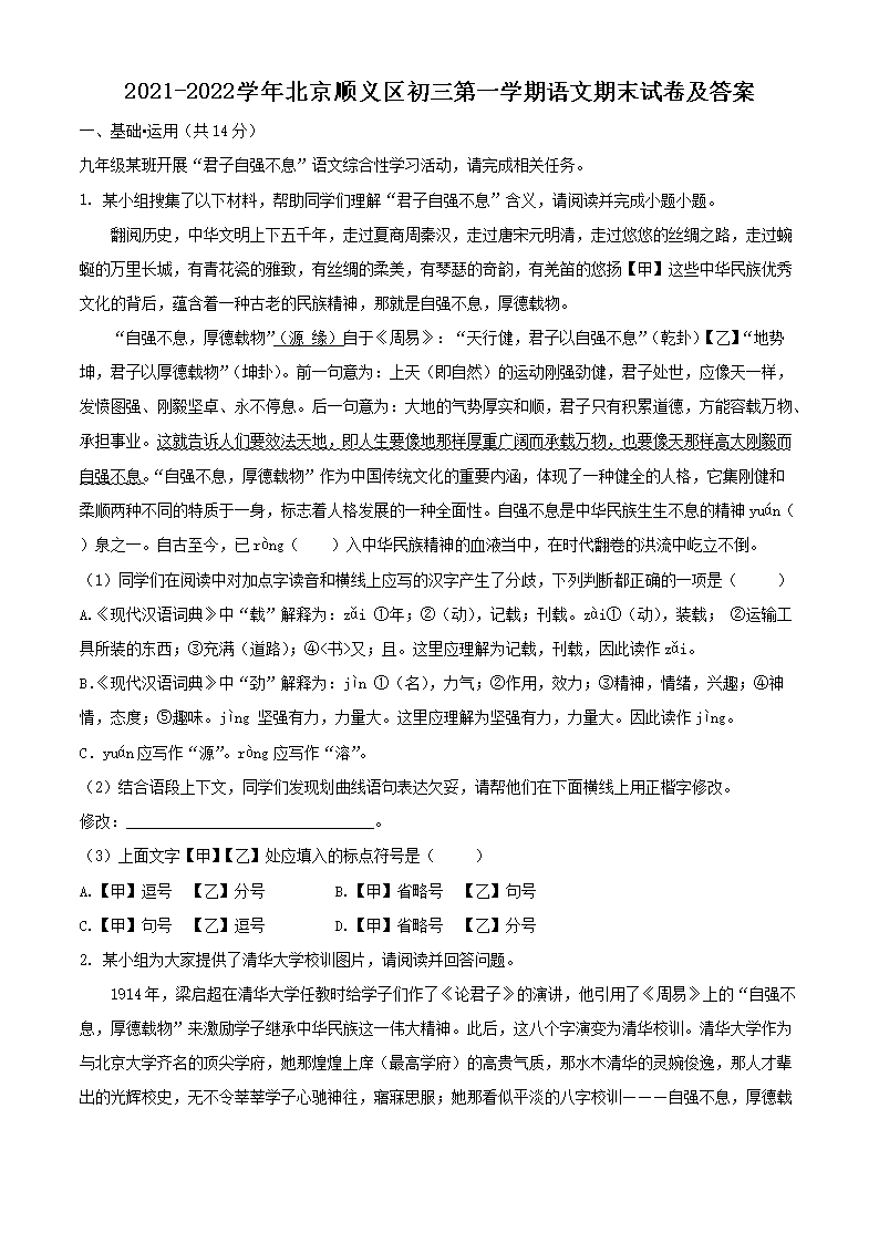 2021-2022学年北京顺义区初三第一学期语文期末试卷及答案(Word版)06-30
