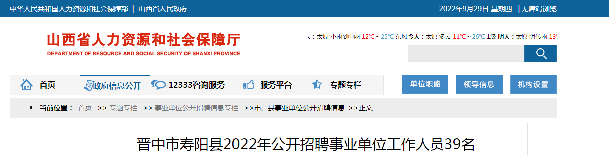 2022年山西省晋中市寿阳县事业单位工作人员公开招聘公告【39人】09-30