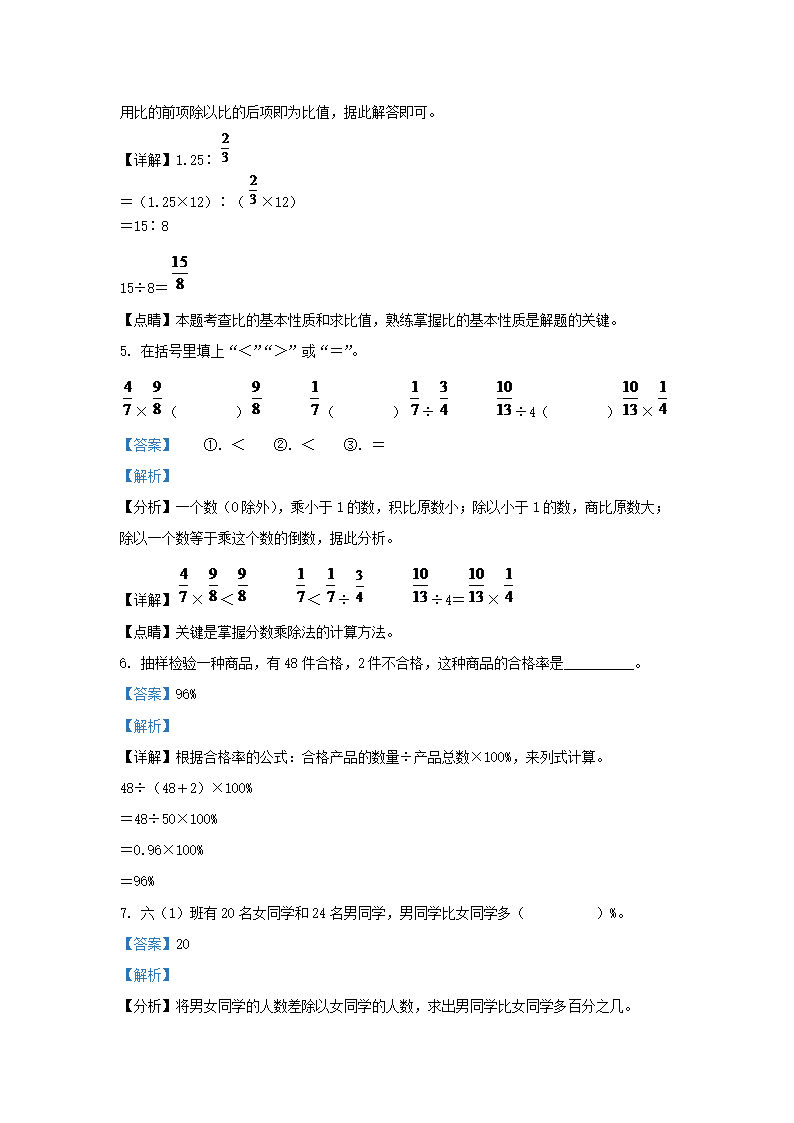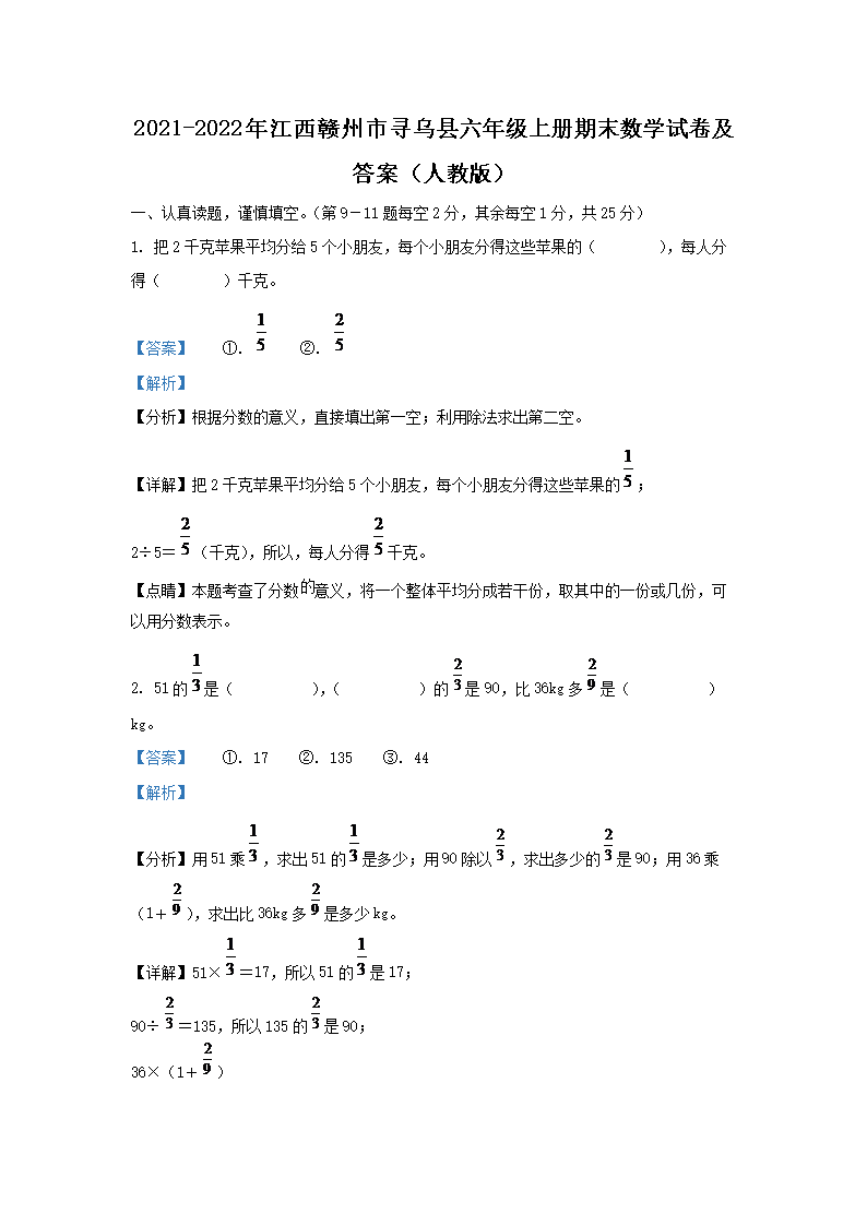 2021-2022年江西赣州市寻乌县六年级上册期末数学试卷及答案(人教版)(Word版)10-14