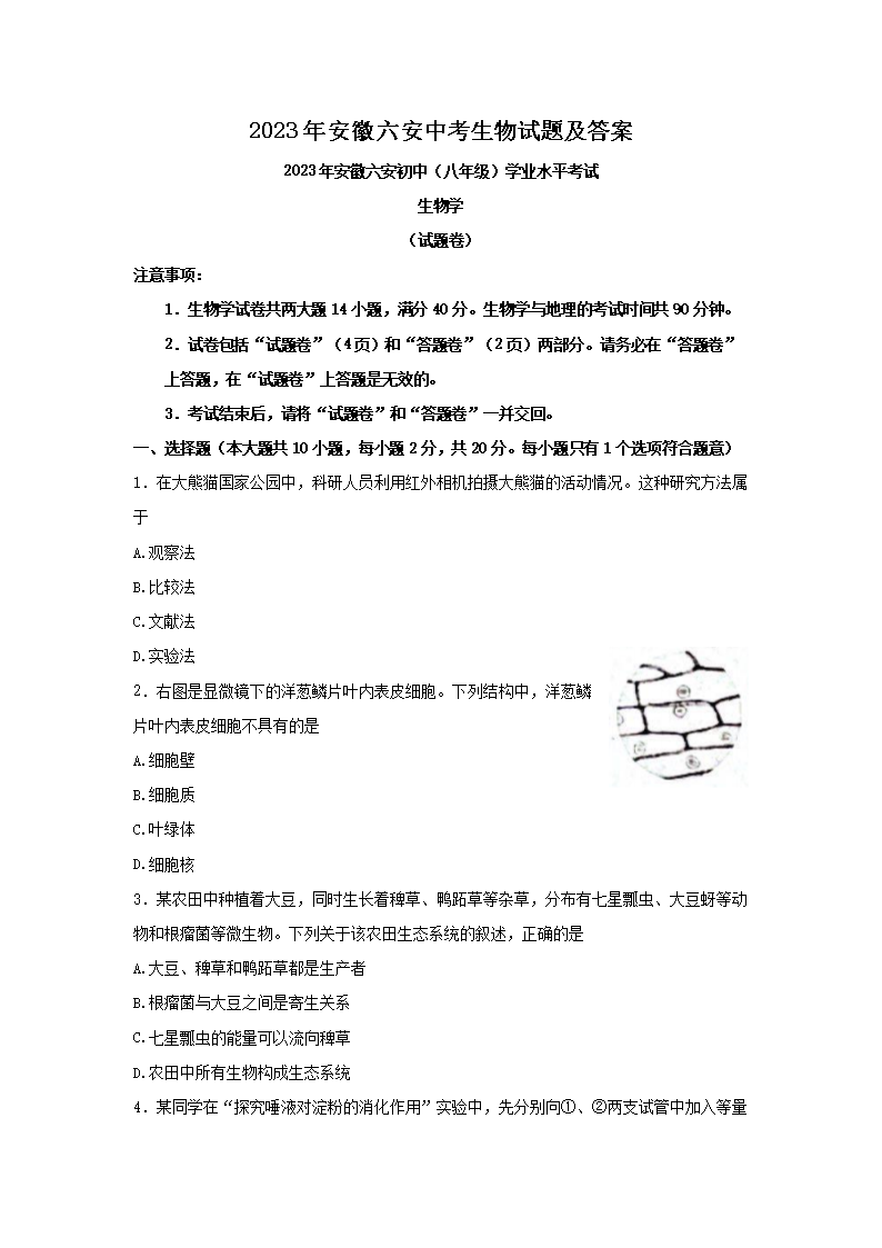2023年安徽六安中考生物试题及答案(Word版)06-20