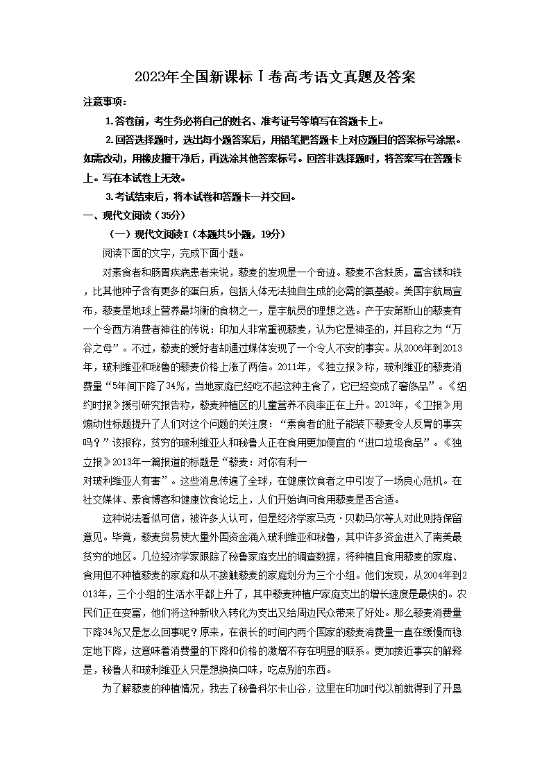 2023年全国新课标Ⅰ卷高考语文真题及答案(Word版)06-14