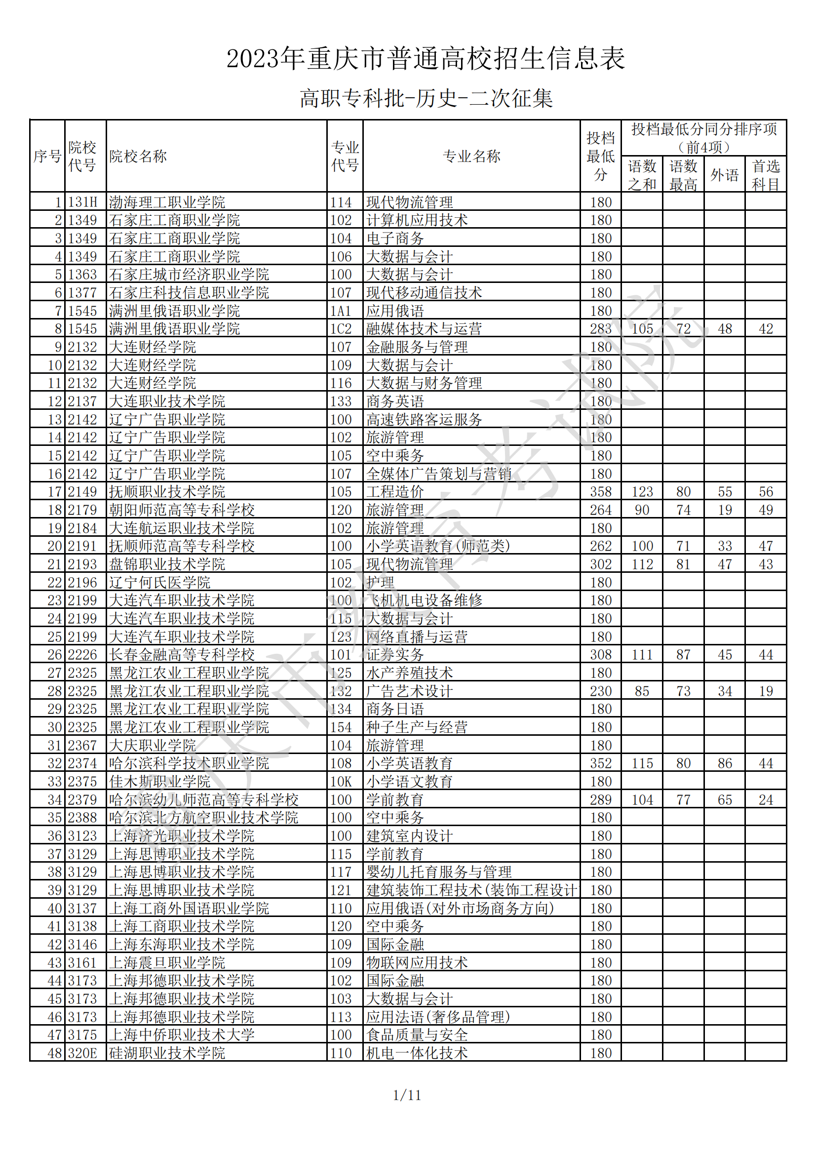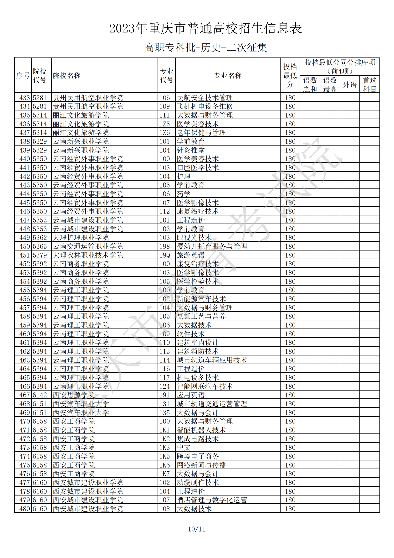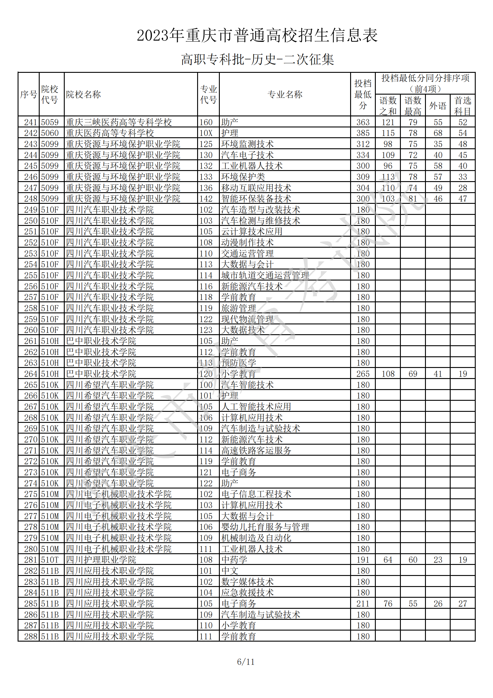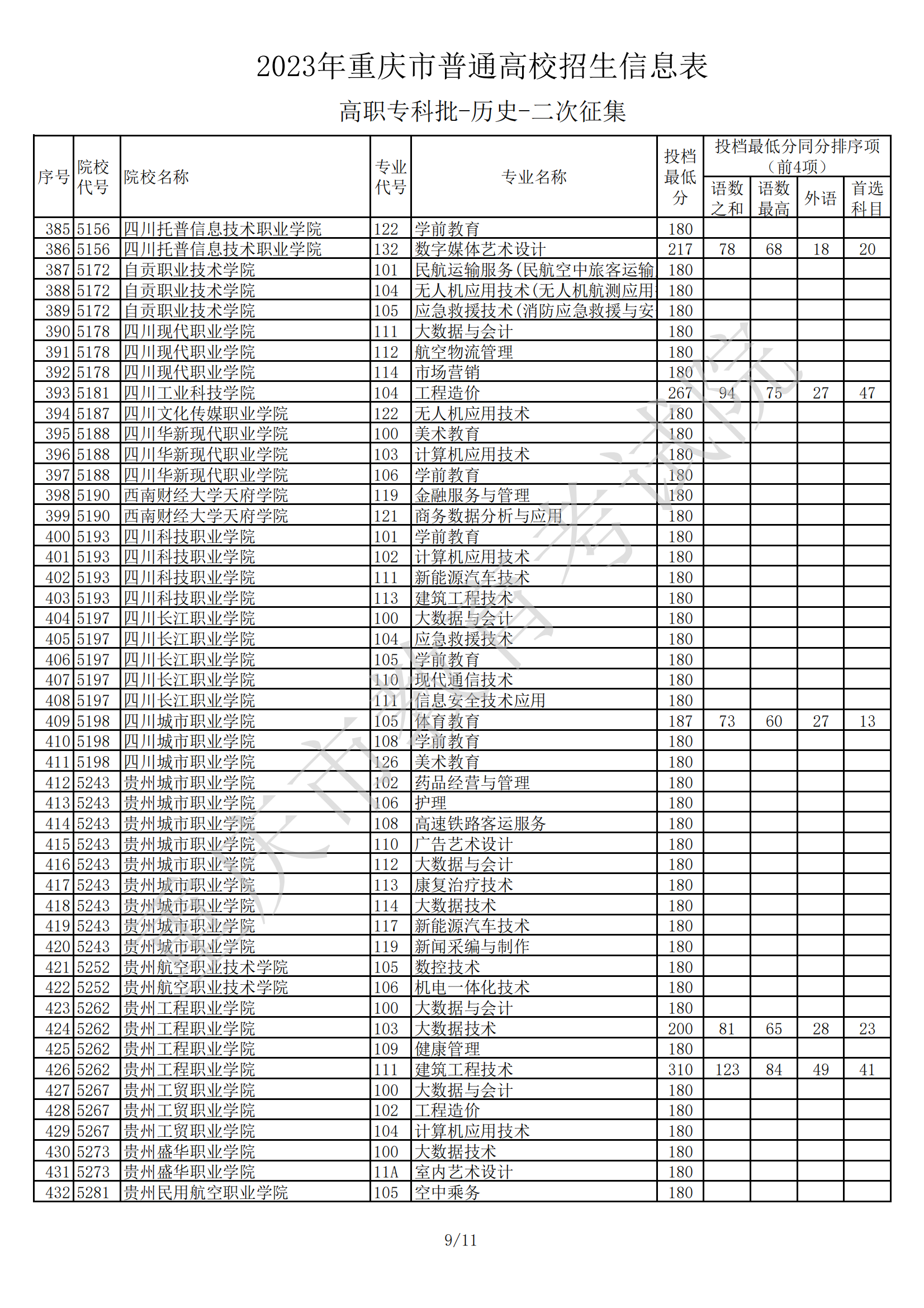 2023年重庆市普通高校招生信息表(高职专科批-历史-二次征集)08-15