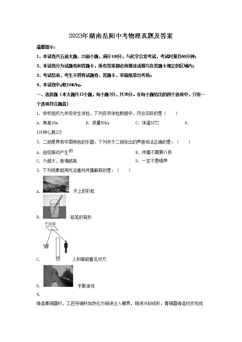 【文档预览】 文档大全网整理发布2023年湖南岳阳中考物理真题及答案(Word版),前五页预览如下: