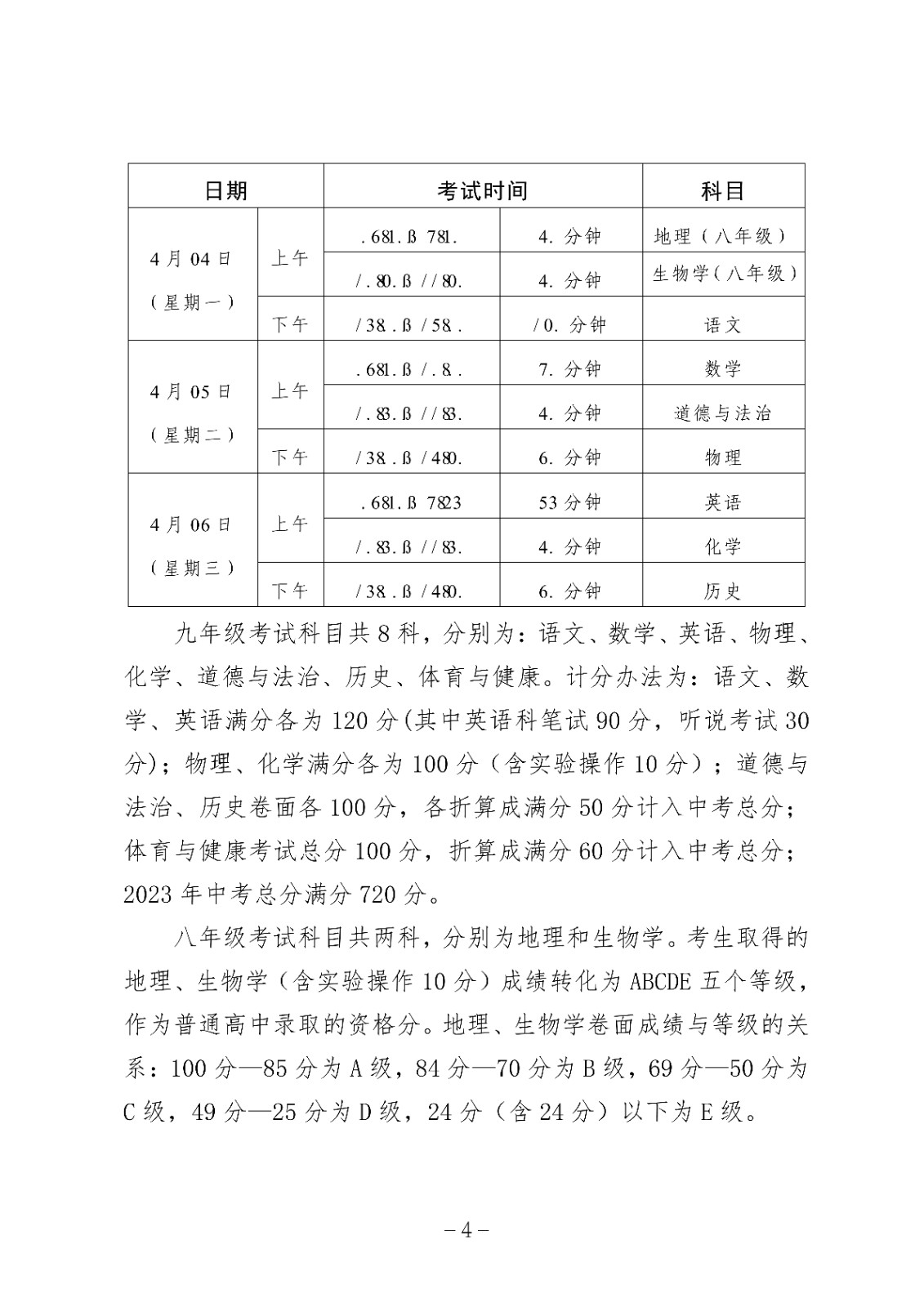 九年级考试科目共8科,分别为:语文、数学、英语、物理、化学、道德与法治、历史、体育与健康。计分办法为:语文、数学、英语满分各为120分(其中英语科笔试90分,听说考试30分);物理、化学满分各为100分(含实验操作10分);道德与法治、历史卷面各100分,各折算成满分50分计入中考总分;体育与健康考试总分100分,折算成满分60分计入中考总分;2023年中考总分满分720分。