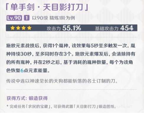 图纸获取方法:完成稻妻地图世界任务「农民的宝藏 」,就能得到天目影打刀图纸。