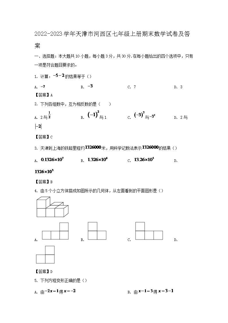 2022-2023学年天津市河西区七年级上册期末数学试卷及答案(Word版)09-15