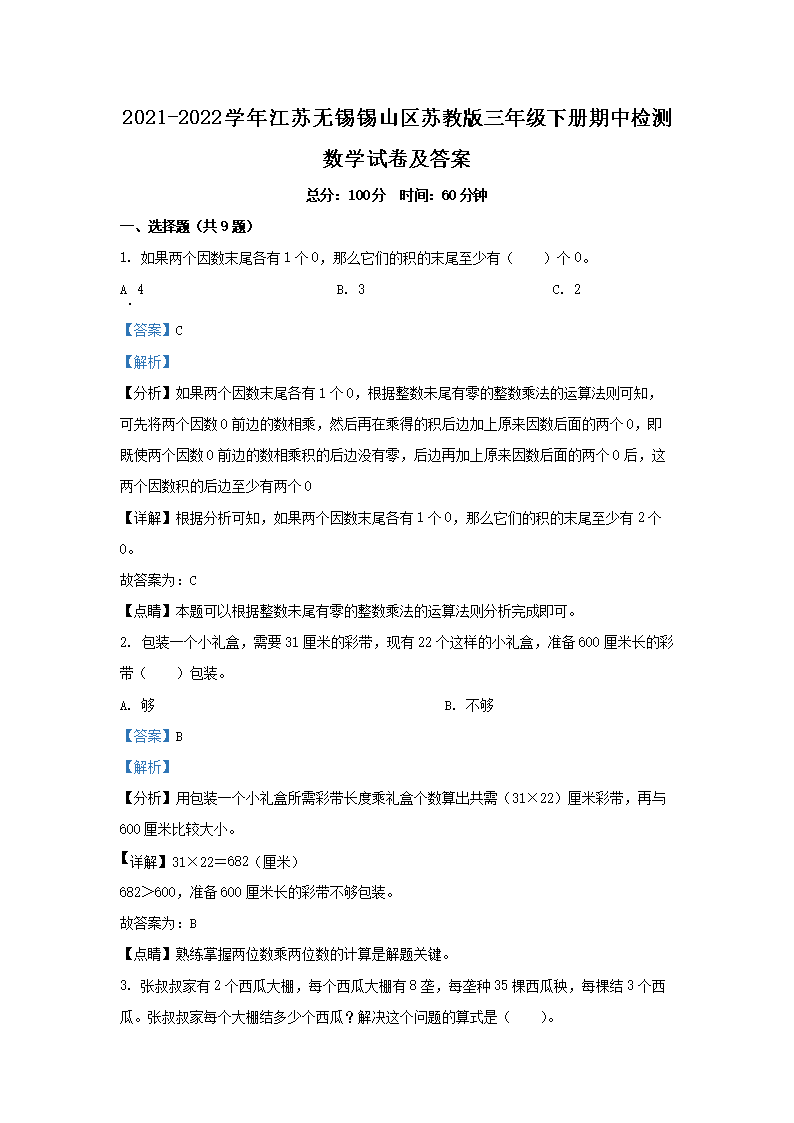 【文档预览】 文档大全网整理发布2021-2022学年江苏无锡锡山区苏教版三年级下册期中检测数学试卷及答案(Word版),前五页预览如下: