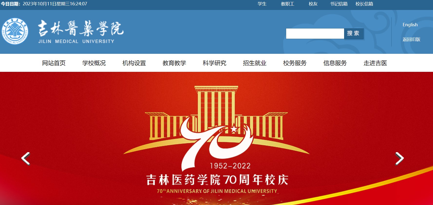 【#教育# #吉林医药学院:http://www.jlmu.cn#】吉林医药学院(Jilin Medical University)位于吉林省吉林市,学校是吉林省独立设置的一所西医本科院校,吉林省硕士学位授权单位立项建设A类高校,省属首批联合培养硕士研究生工作试点单位。®文档大全网搜集的吉林医药学院网站网址,仅供大家参考!