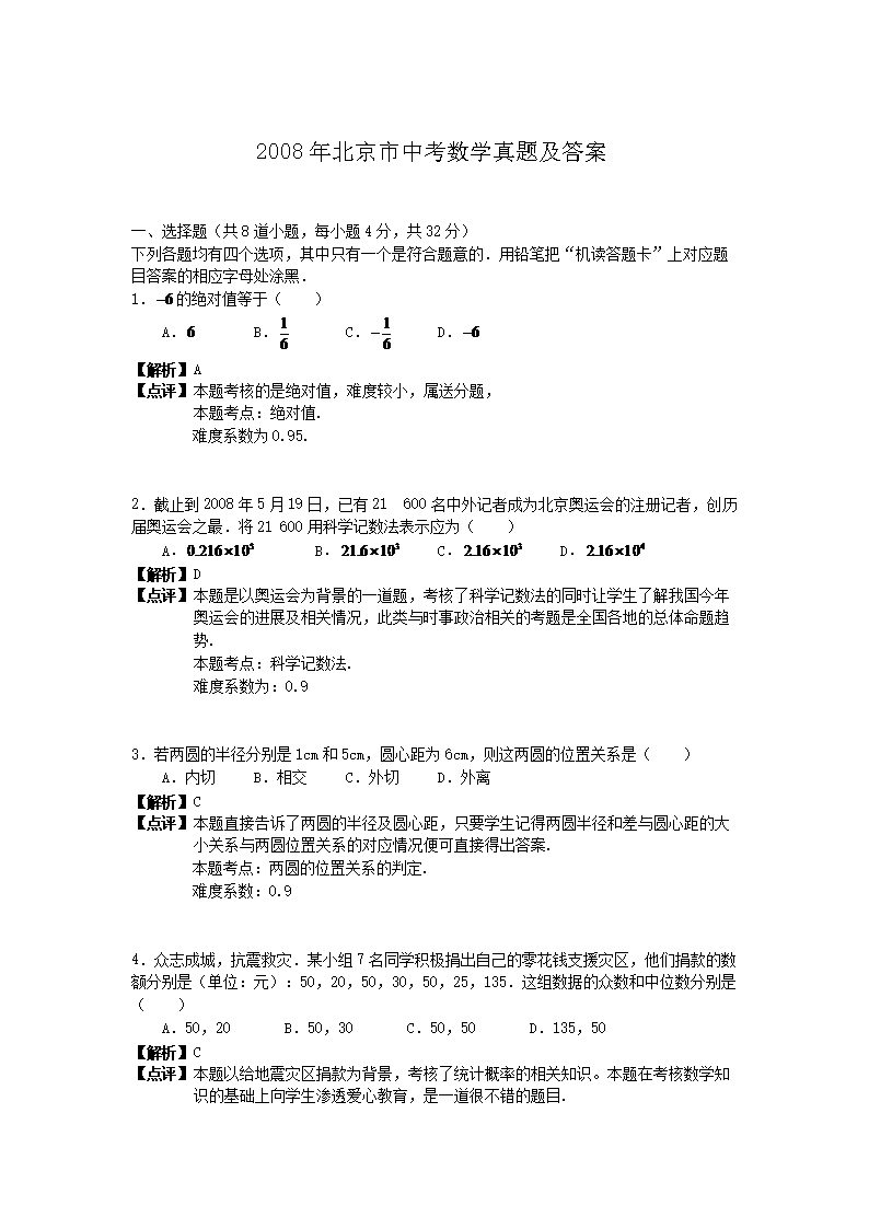 【文档预览】 文档大全网整理发布2008年北京市中考数学真题及答案(Word版),前五页预览如下: