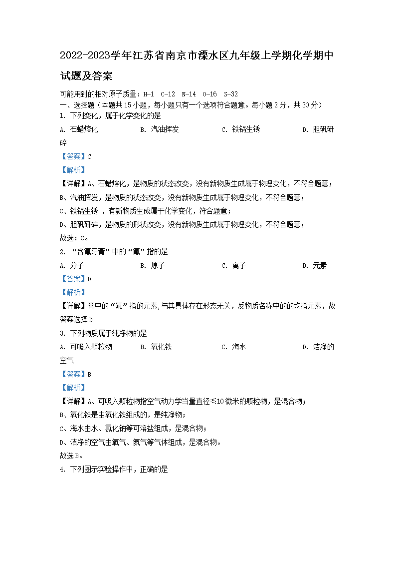 【文档预览】 文档大全网整理发布2022-2023学年江苏省南京市溧水区九年级上学期化学期中试题及答案(Word版),前五页预览如下: