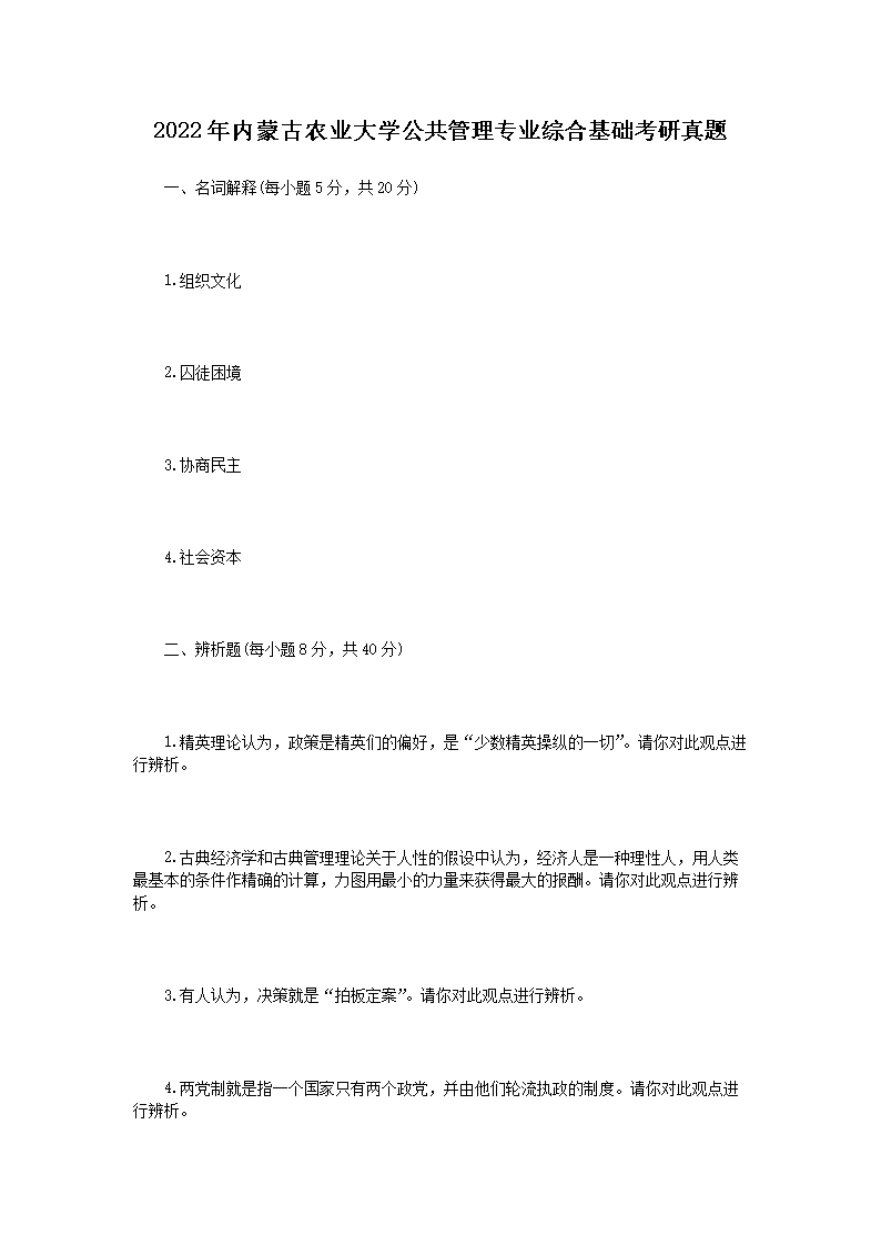 2022年内蒙古农业大学公共管理专业综合基础考研真题(Word版)07-06