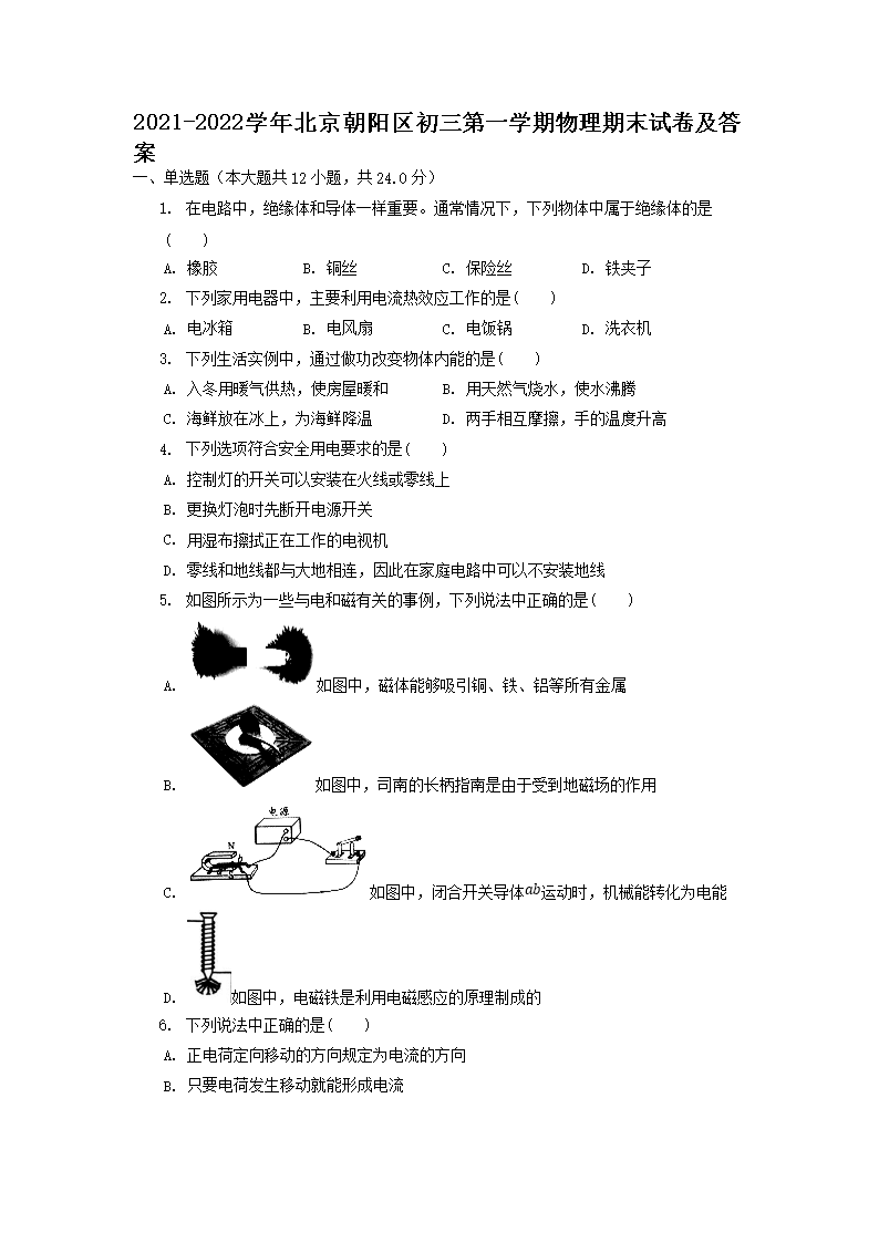 【文档预览】 文档大全网整理发布2021-2022学年北京朝阳区初三第一学期物理期末试卷及答案(Word版),前五页预览如下: