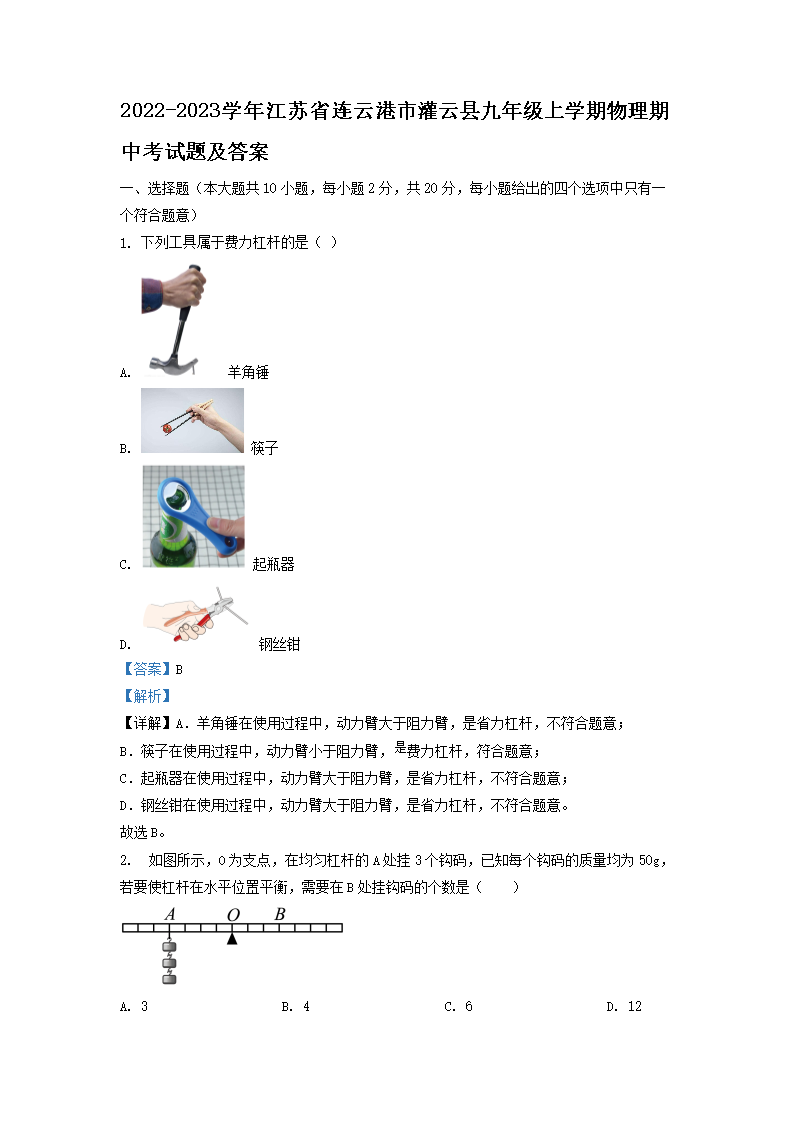 2022-2023学年江苏省连云港市灌云县九年级上学期物理期中考试题及答案(Word版)10-11