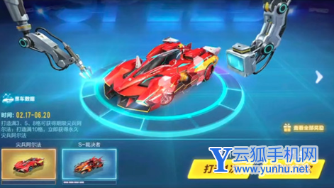 在2月17日-6月20日期间,前往赛车工坊使用紫电能源打造,即有机会获得永久A车尖兵阿尔法。参与打造用的紫电能源可在商城购买紫电能源宝箱获取,售价300点券/个。