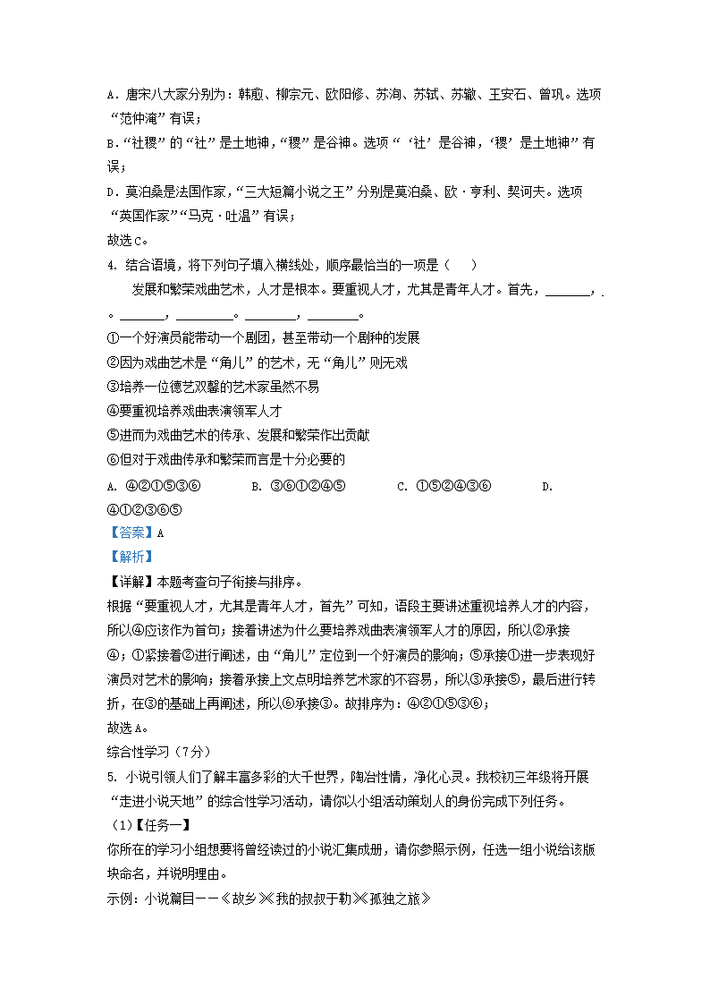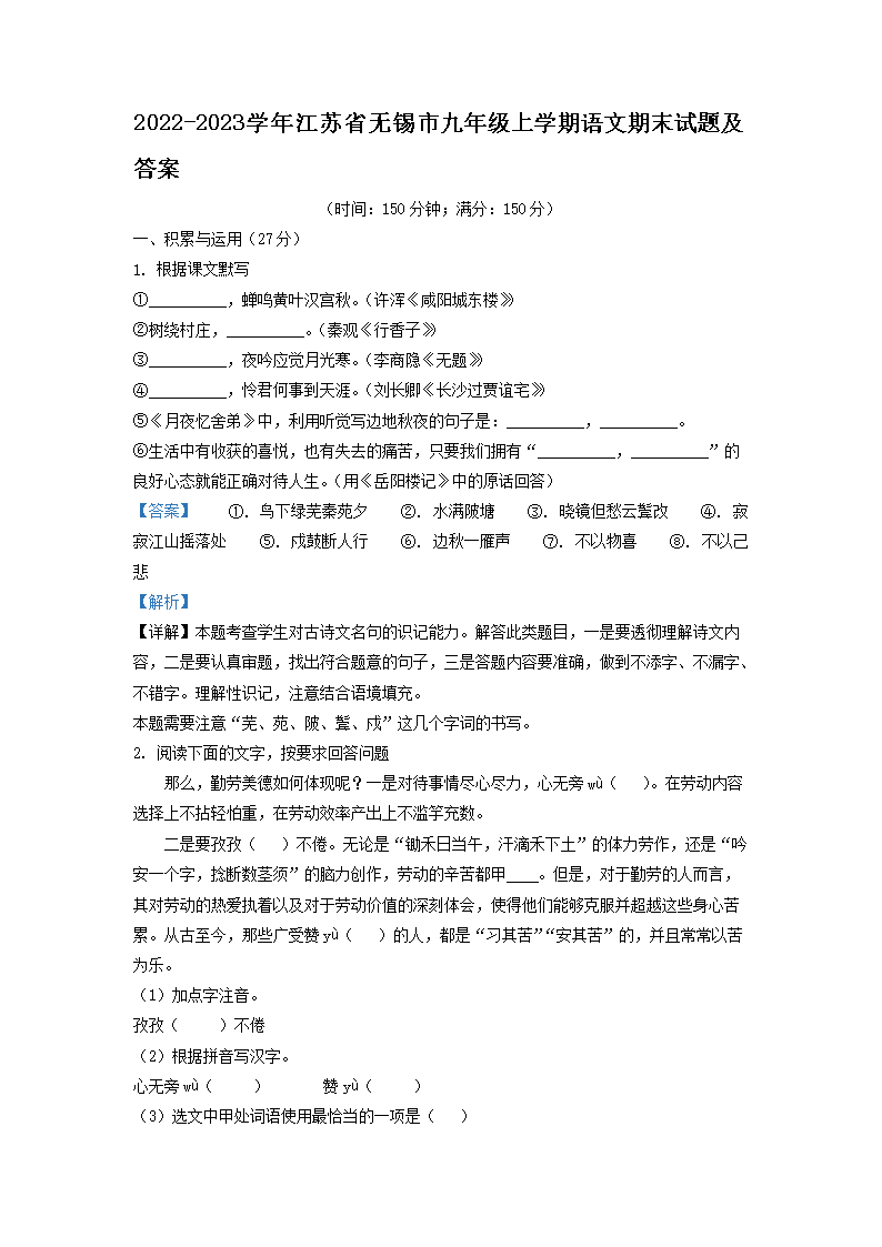 2022-2023学年江苏省无锡市九年级上学期语文期末试题及答案(Word版)09-09