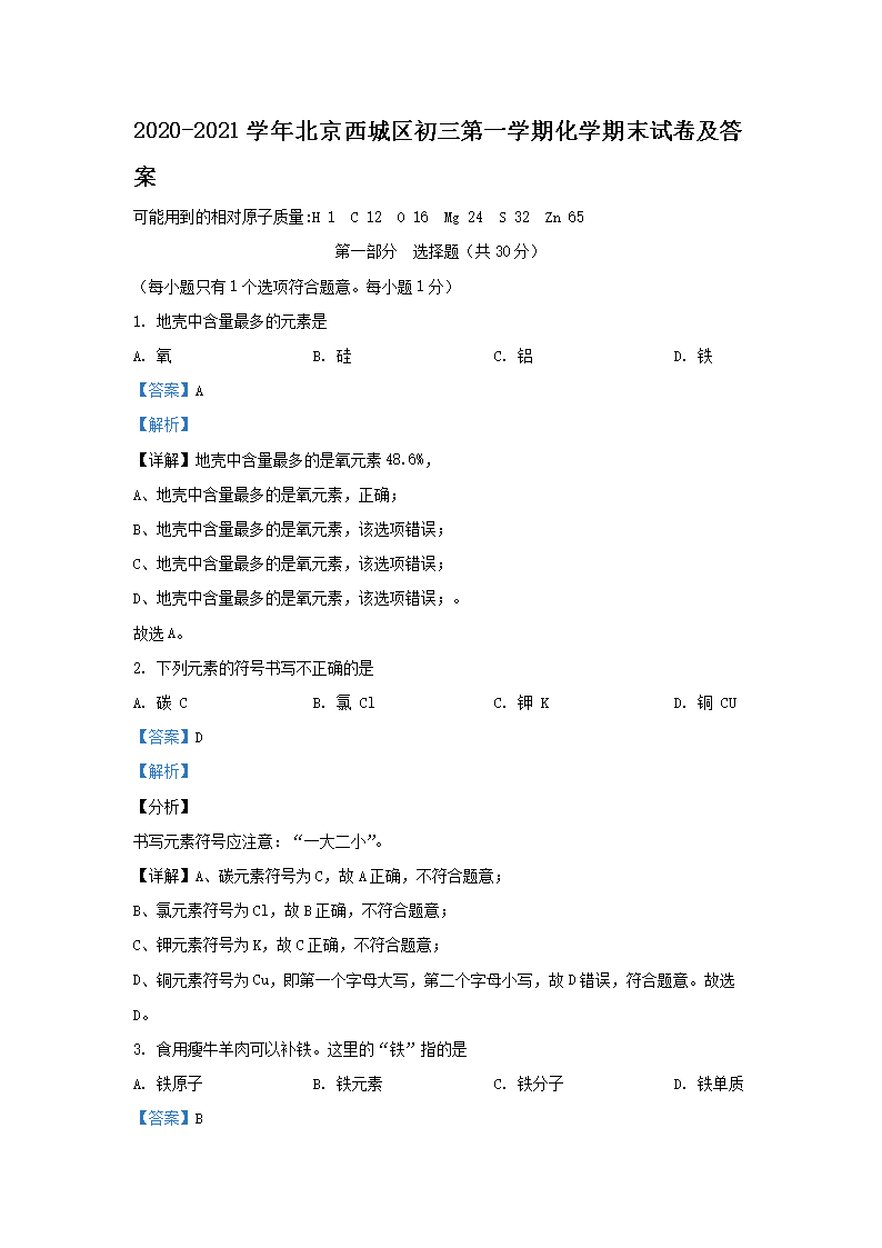【文档预览】 文档大全网整理发布2020-2021学年北京西城区初三第一学期化学期末试卷及答案(Word版),前五页预览如下: