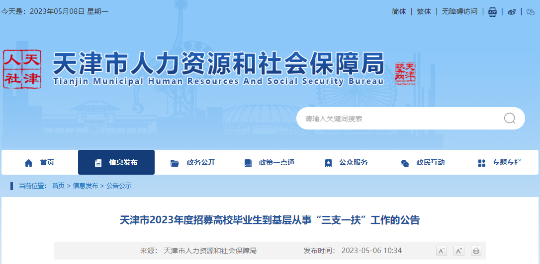 原文标题:天津市2023年度招募高校毕业生到基层从事“三支一扶”工作的公告