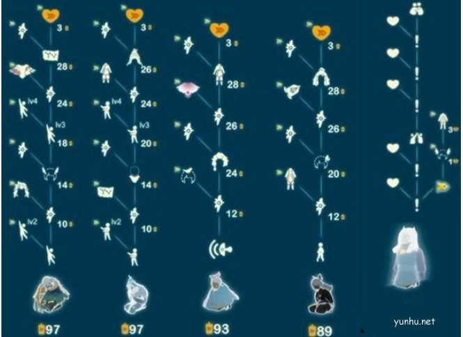 这个季节包含4个先祖,2个斗篷,4条裤子,4个发型,4个头饰,1个乐器,1个站姿,1个叫声,2个动作,还有1个领结。主卡毕业大概需要58天,副卡毕业60天。