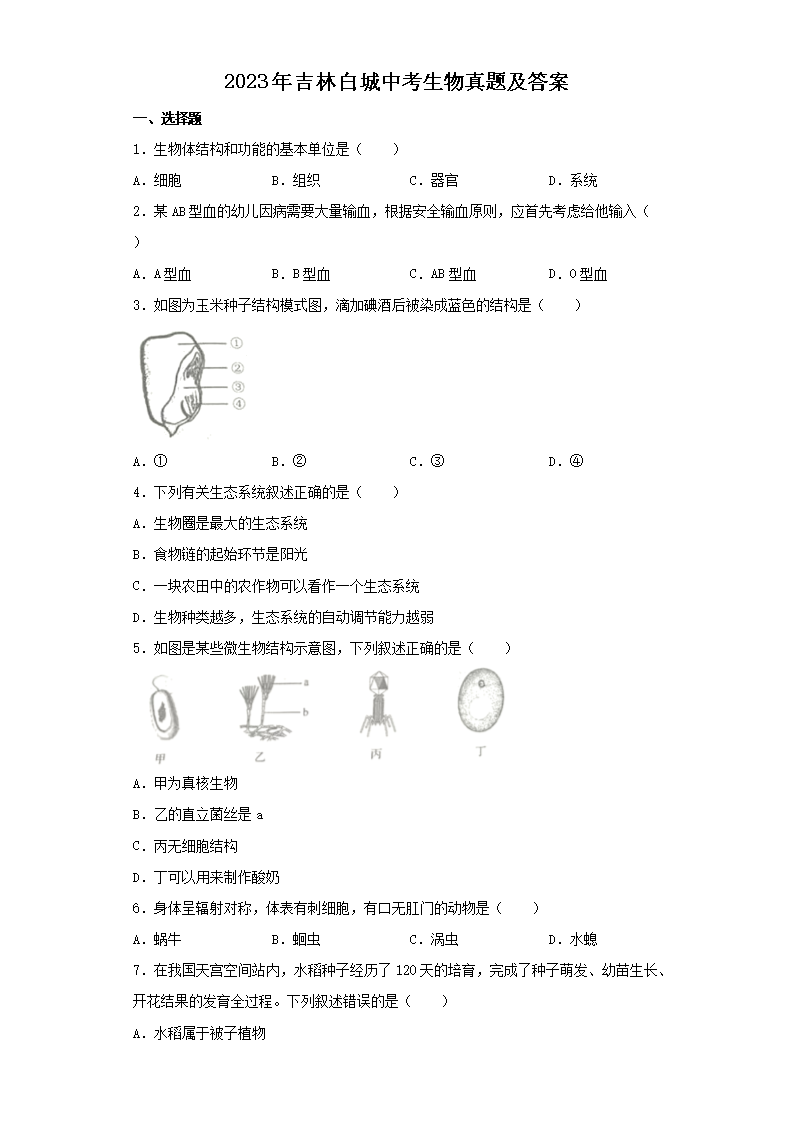 【文档预览】 文档大全网整理发布2023年吉林白城中考生物真题及答案(Word版),前五页预览如下: