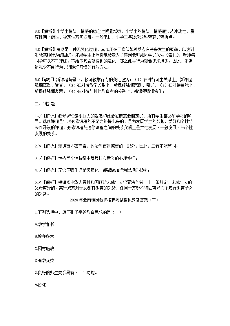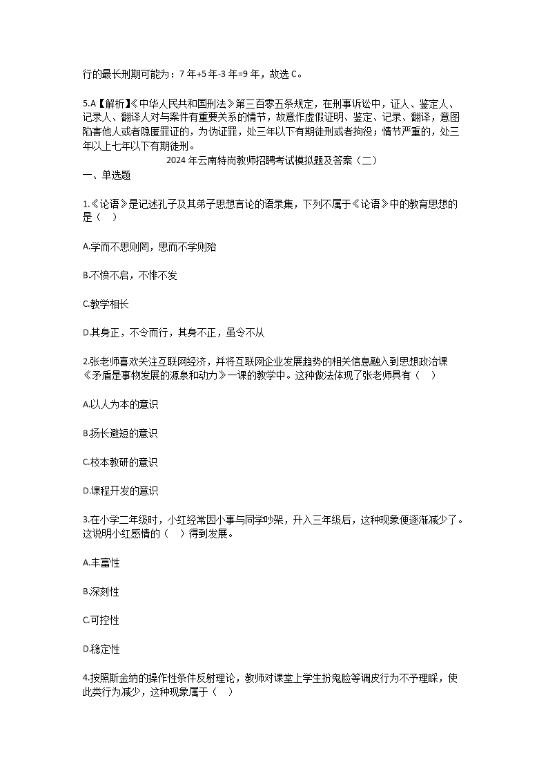 2024年云南特岗教师招聘考试模拟题及答案(Word版)10-20