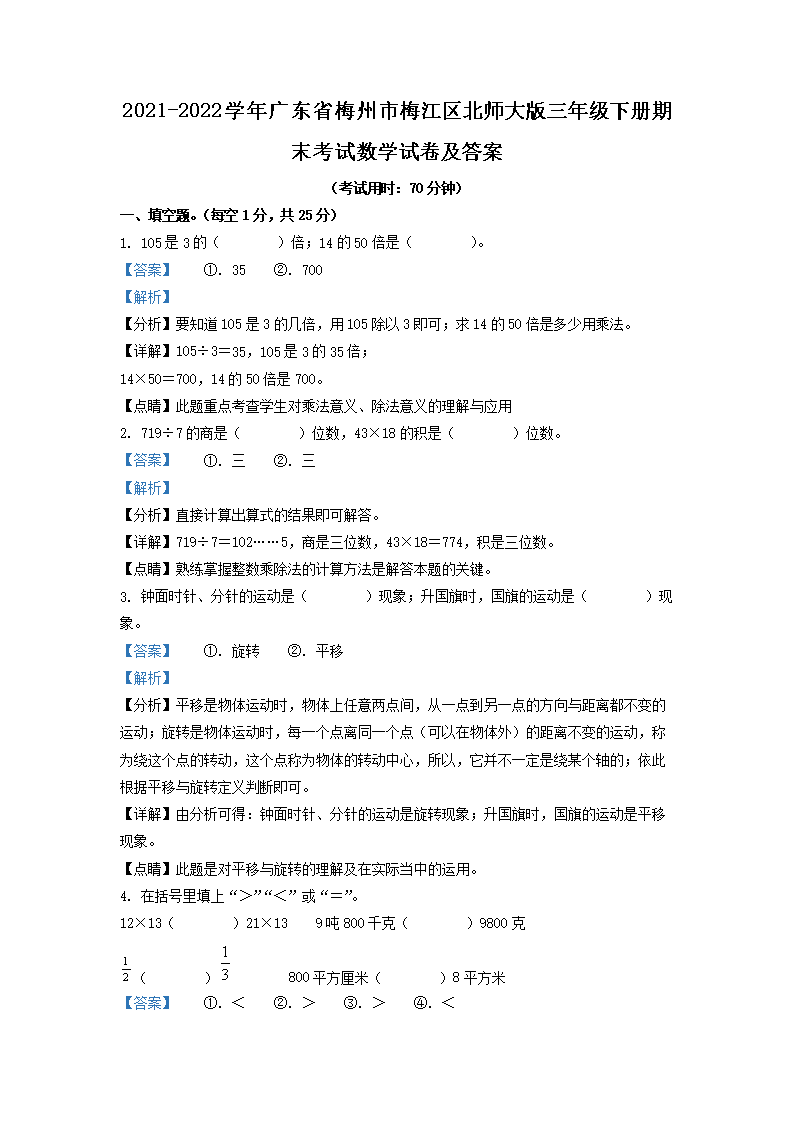 【文档预览】 文档大全网整理发布2021-2022学年广东省梅州市梅江区北师大版三年级下册期末考试数学试卷及答案(Word版),前五页预览如下: