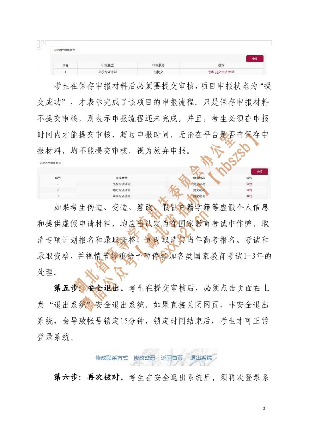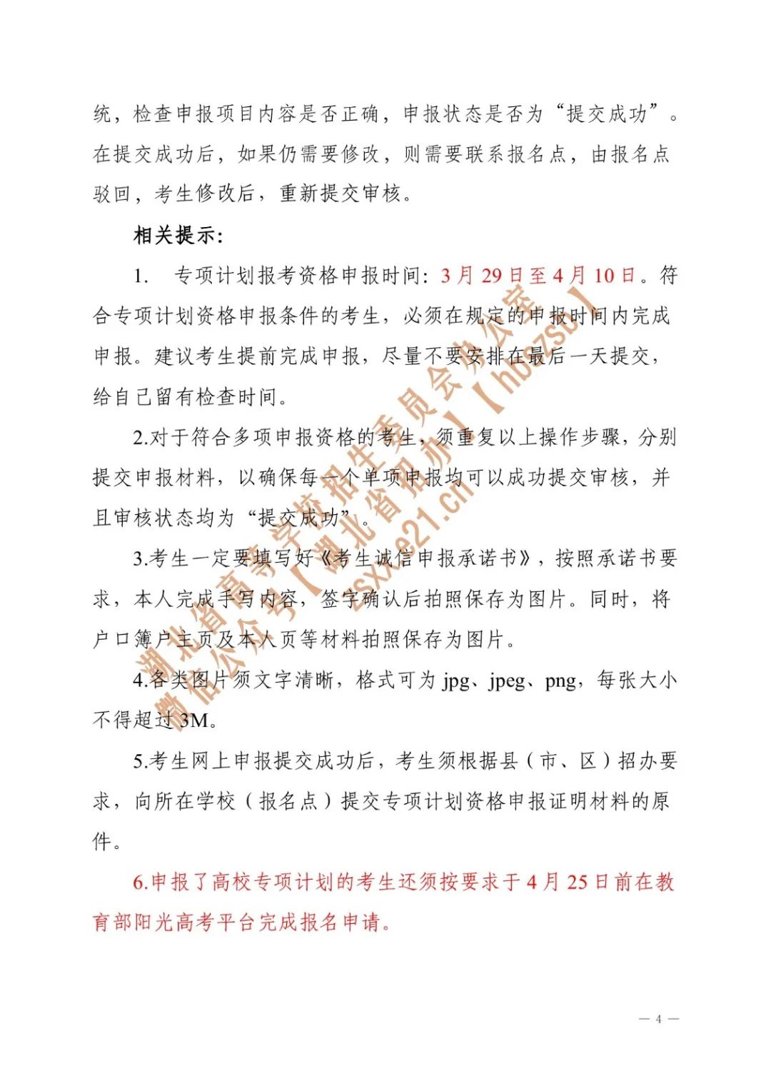 湖北省2023年普通高校招生专项计划报考资格继续实行网上申报,考生个人申报时间为3月29日至4月10日,逾期不再受理。