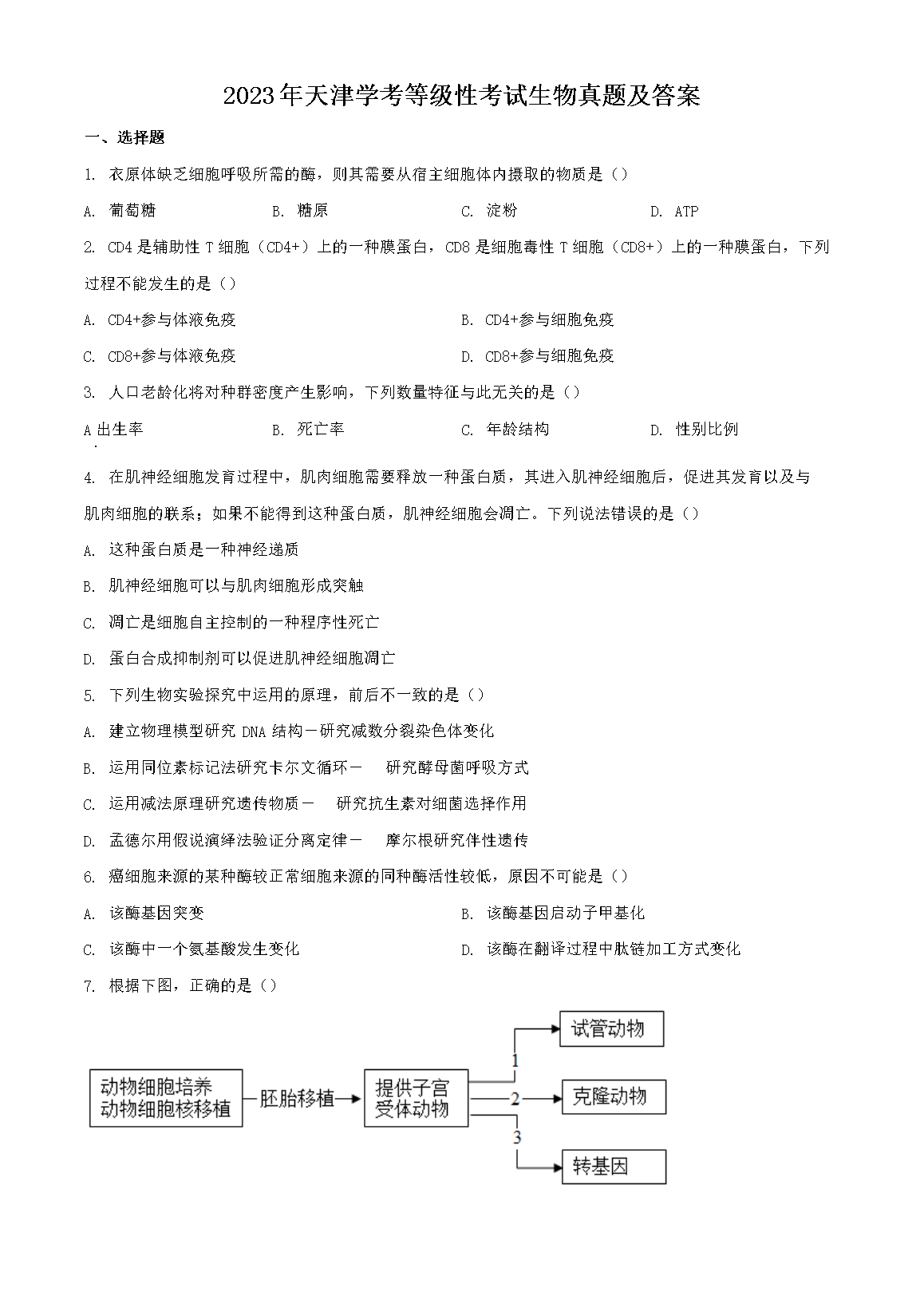 2023年天津学考等级性考试生物真题及答案(Word版)08-16