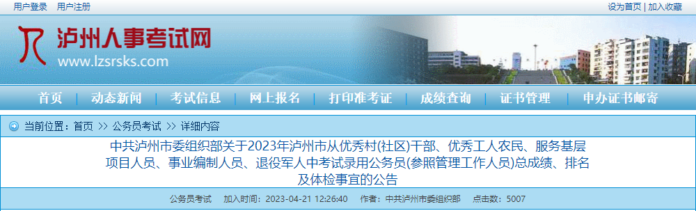 2023年四川泸州市委组织部考试录用公务员总成绩、排名及体检事宜的公告04-24