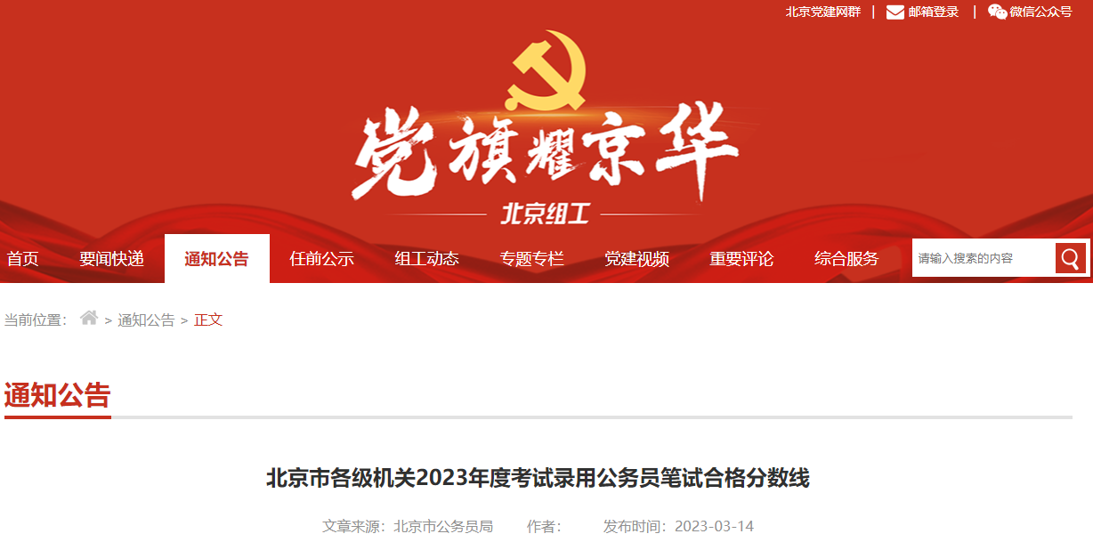 北京市各级机关2023年度考试录用公务员笔试成绩于2023年3月14日公布,考生可在北京市人事考试通用平台、“北京人社”微信公众号和北京人社APP查询。