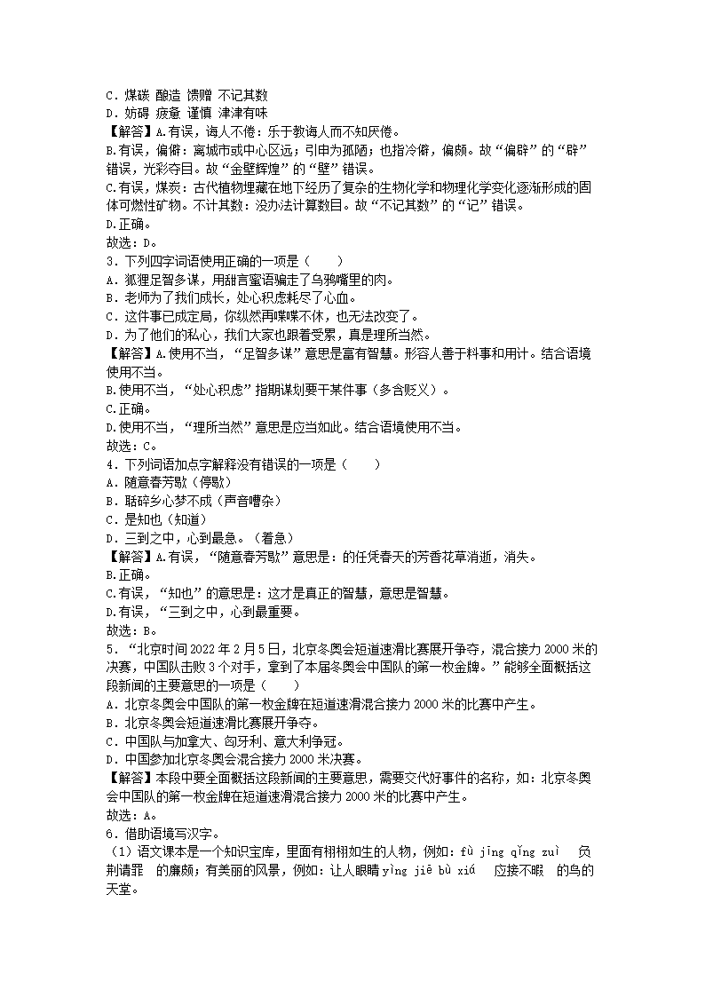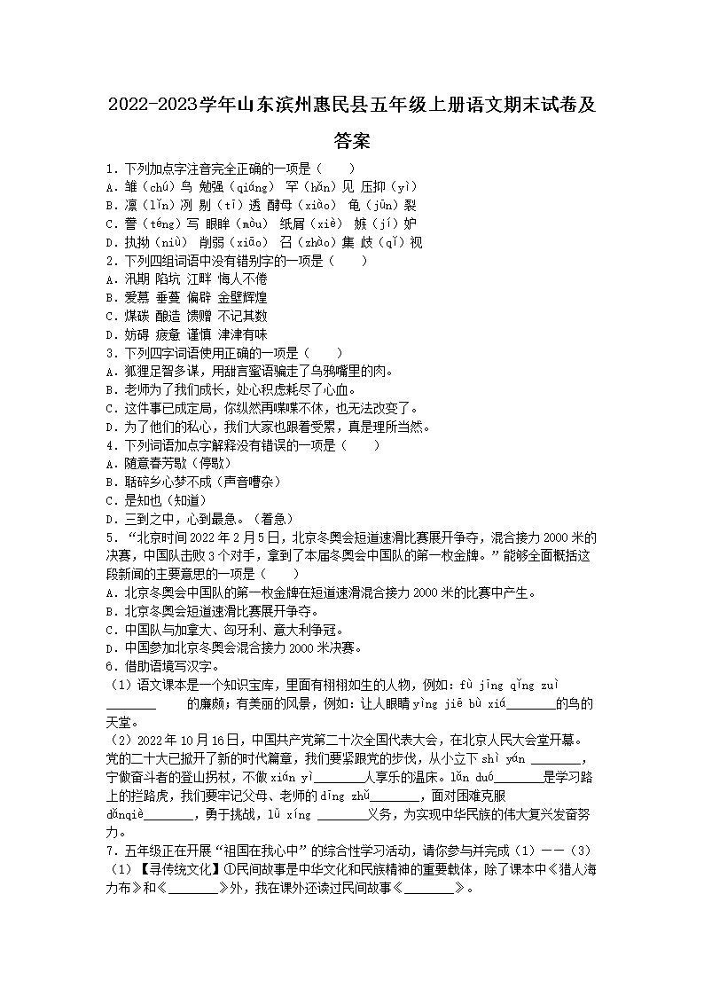 2022-2023学年山东滨州惠民县五年级上册语文期末试卷及答案(Word版)08-26