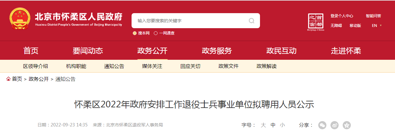 2022年北京市怀柔区政府安排工作退役士兵事业单位拟聘用人员公示09-24