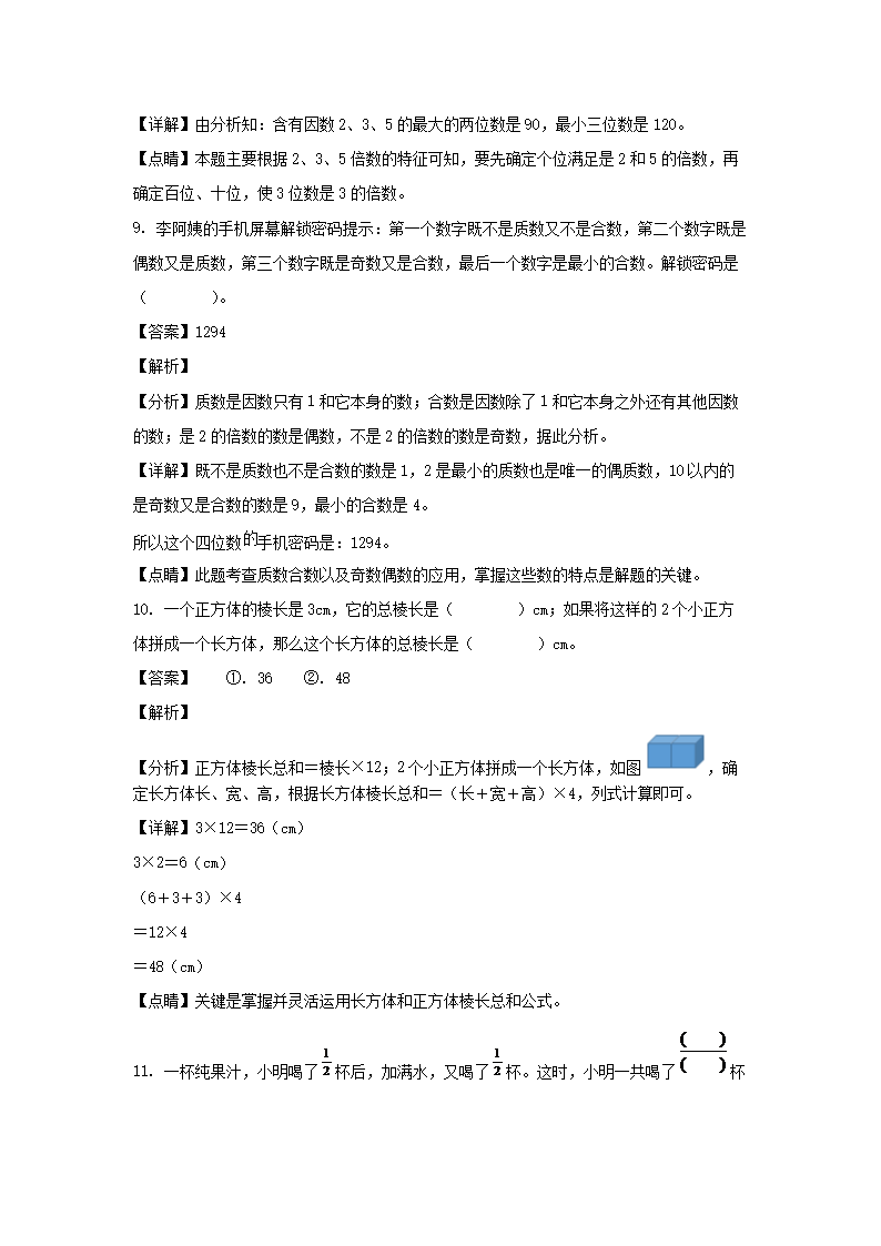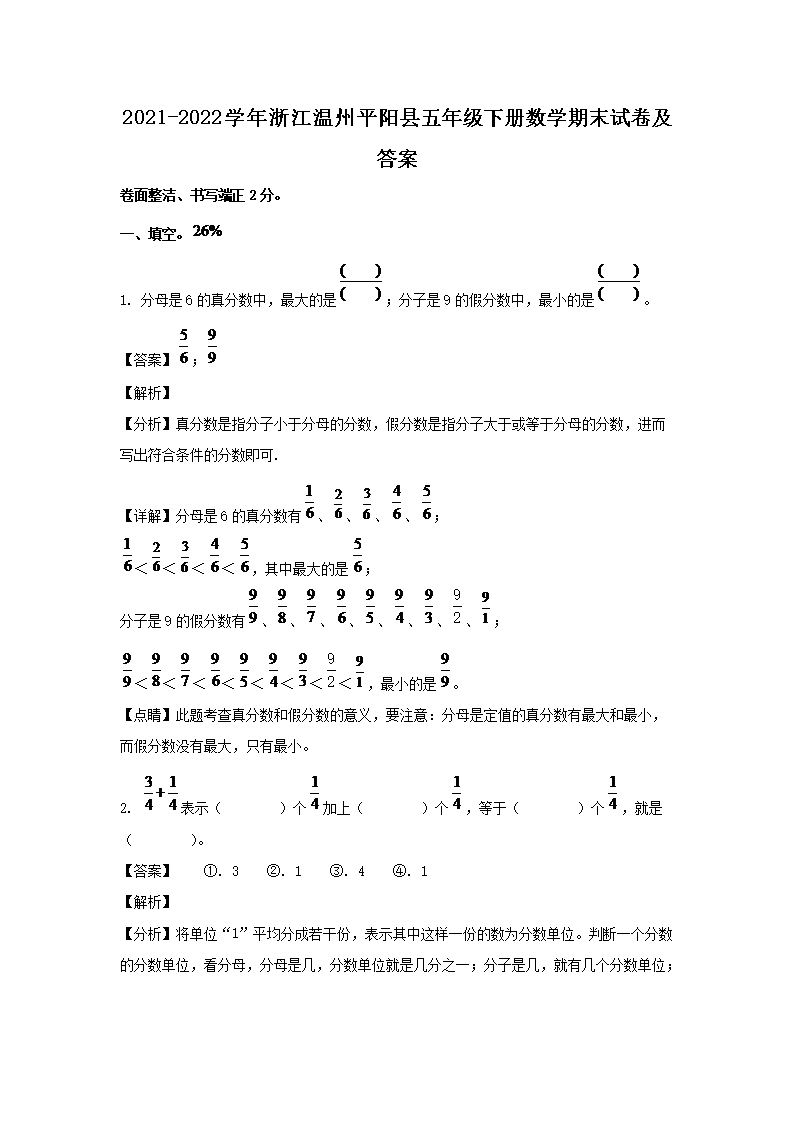 2021-2022学年浙江温州平阳县五年级下册数学期末试卷及答案(Word版)09-26