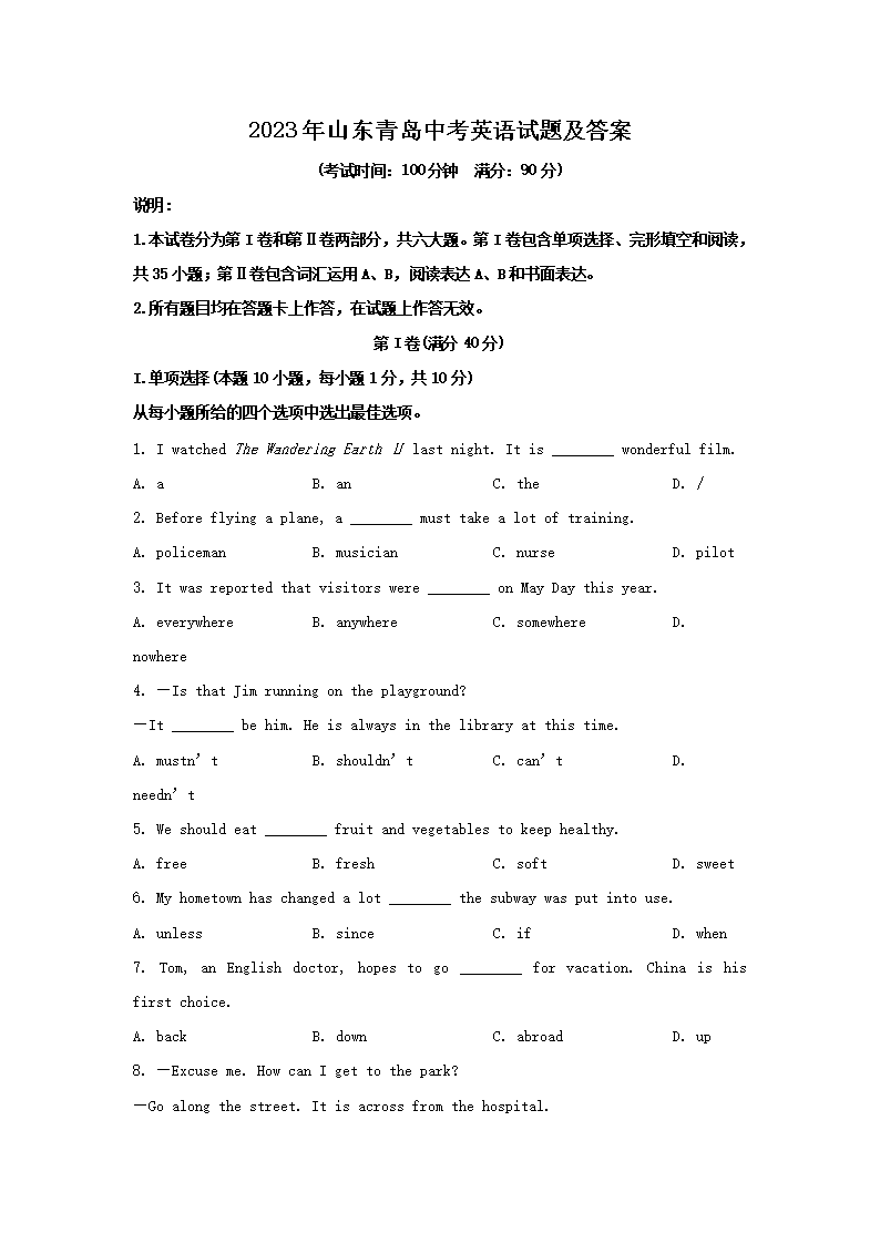 2023年山东青岛中考英语试题及答案(Word版)08-10