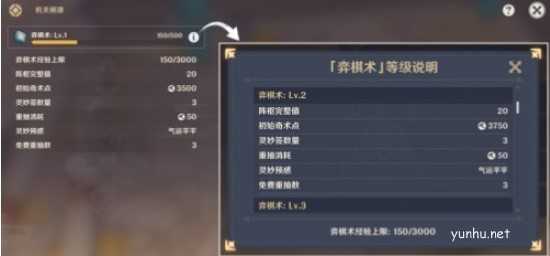 在「棋阵」中完成不同挑战均可获得「弈棋术经验」,提升「弈棋术」等级。升级时「初始原神弈棋术奇术点」等特性也将有所提升,此外还可解锁新的机关与「灵妙签」。