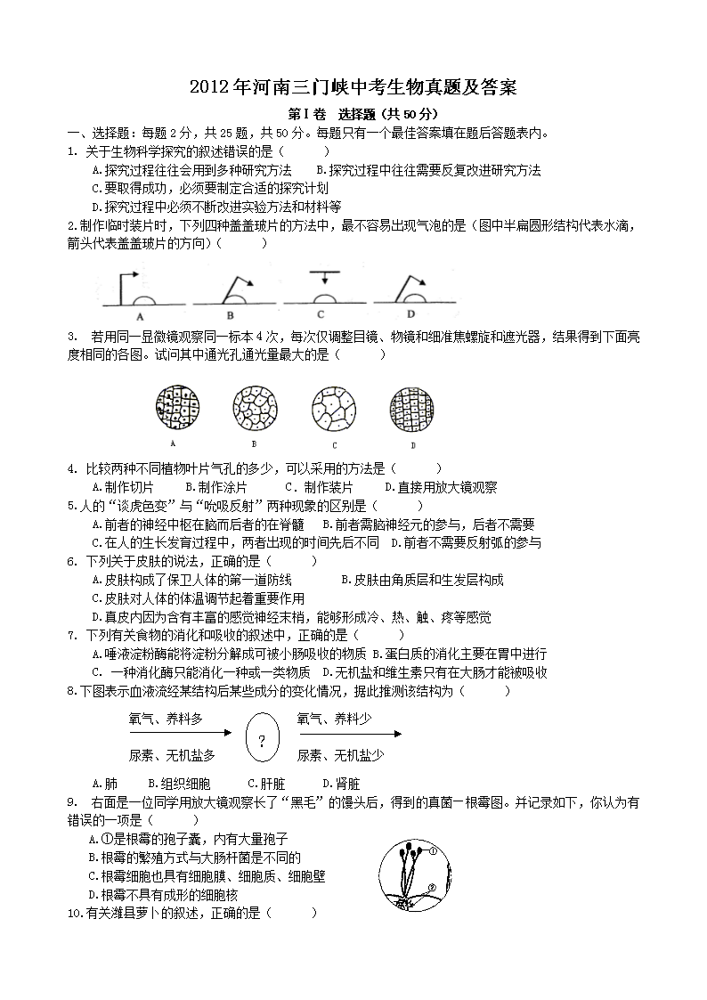 2012年河南三门峡中考生物真题及答案(Word版)06-09